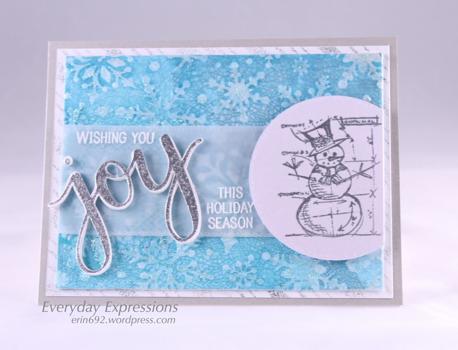 The snowman is from Tim Holtz blueprints mini Christmas rubber stamps, stamped in silver Ranger embossing powder on Crafter’s Companion shimmer pearl white cardstock. I used a My Favorite Things stitched circle die and trimmed the side for effect.