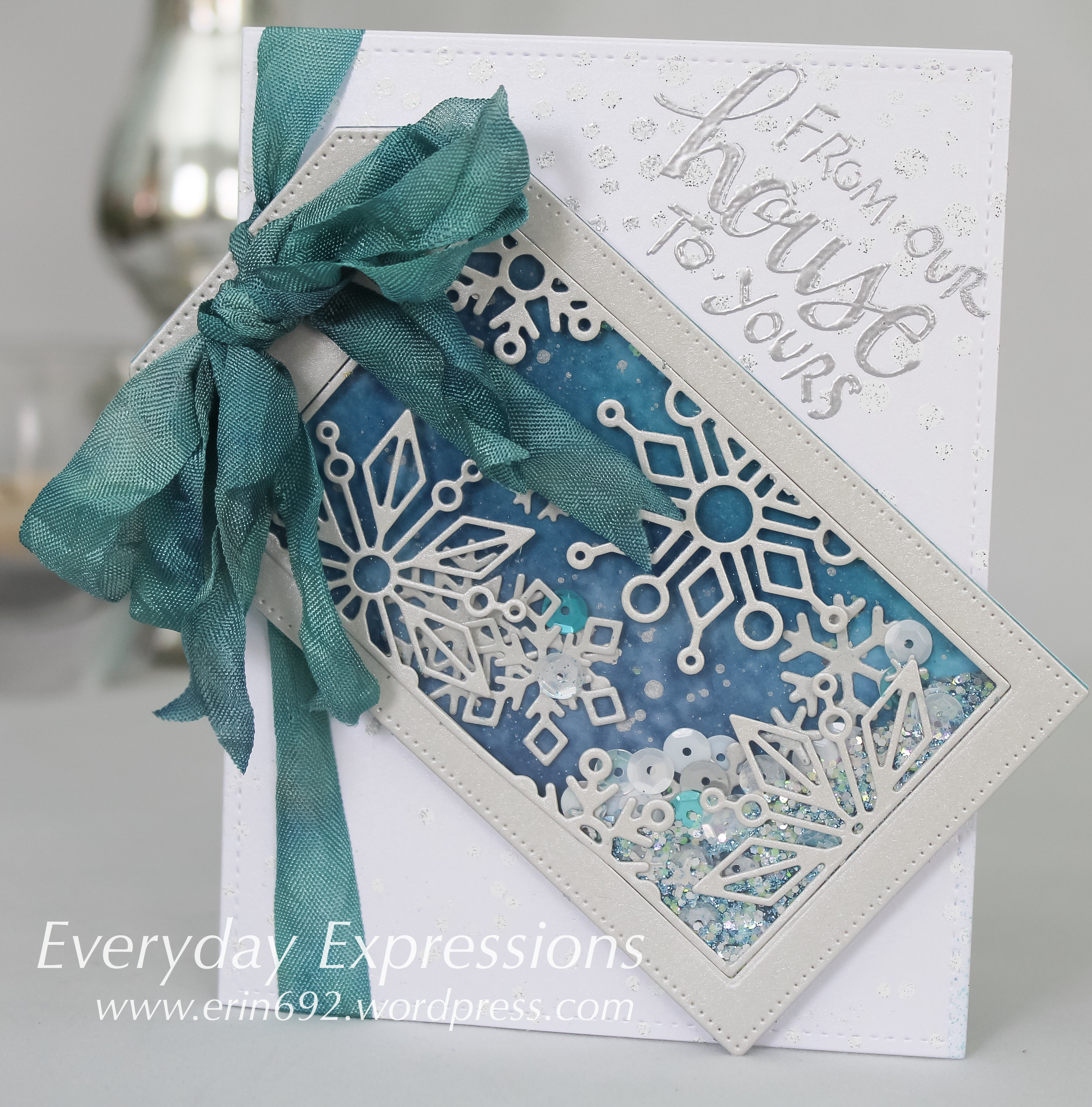 2. Cut the My Favorite Things Stitched tag from watercolor cardstock, and a second from Crafter’s Companion Shimmering Cardstock in Silver Starlight. Then I used the Simon Says Stamp Snowflake block wafer die to cut the window in the tag. I used the MFT tags to cut a foam frame for the shaker card and glued this to the background. The last step was to cut acetate to fit the tag frame.