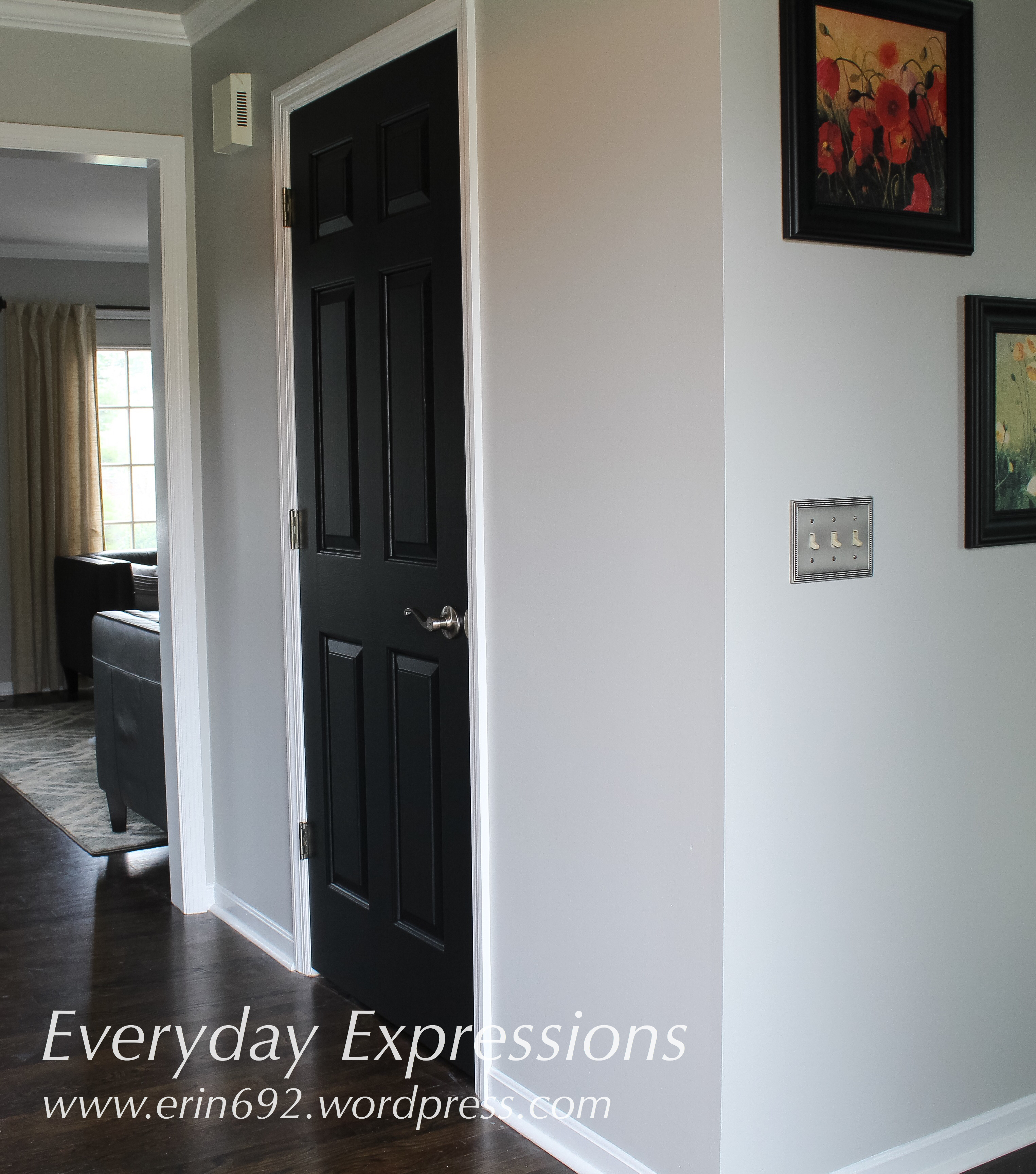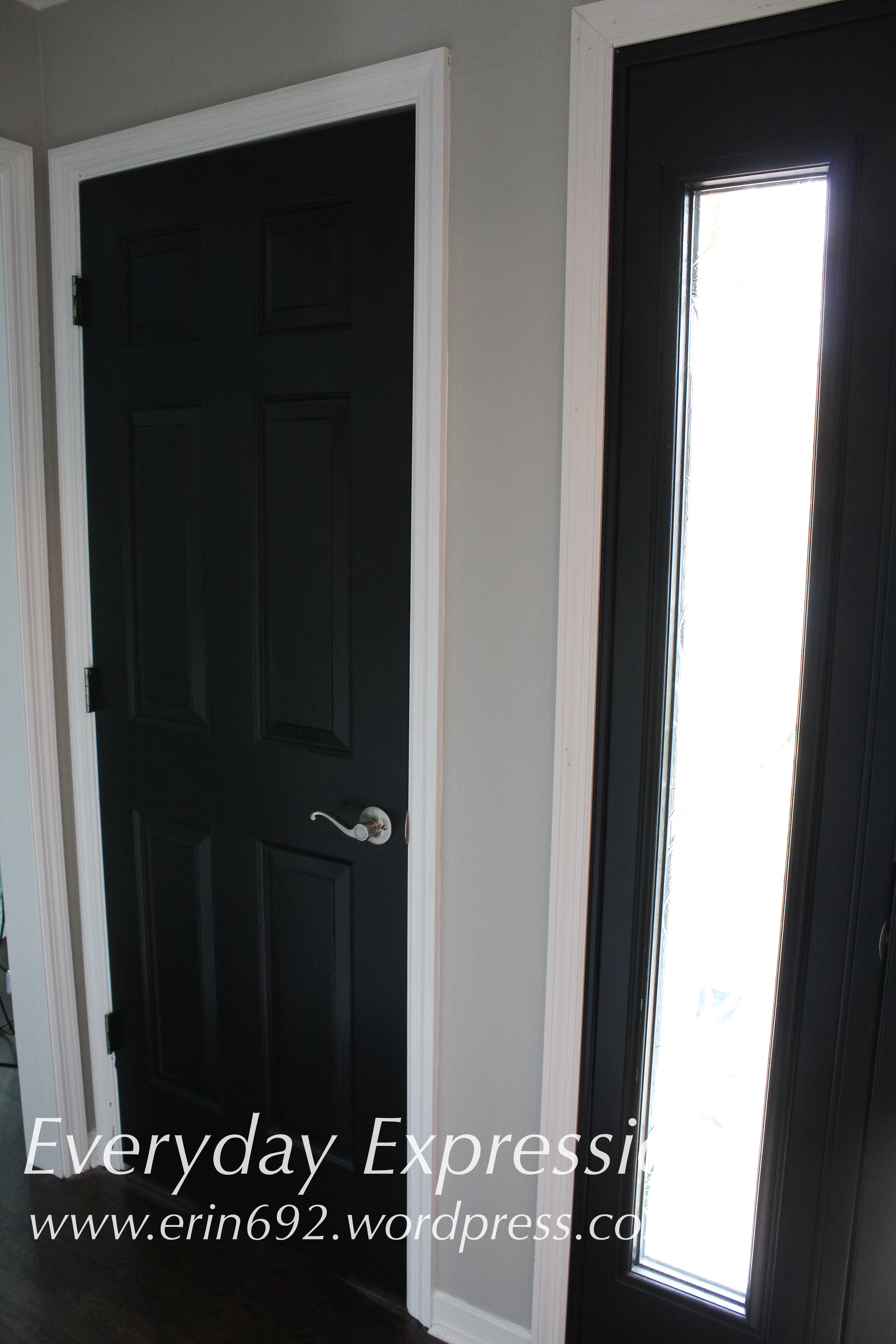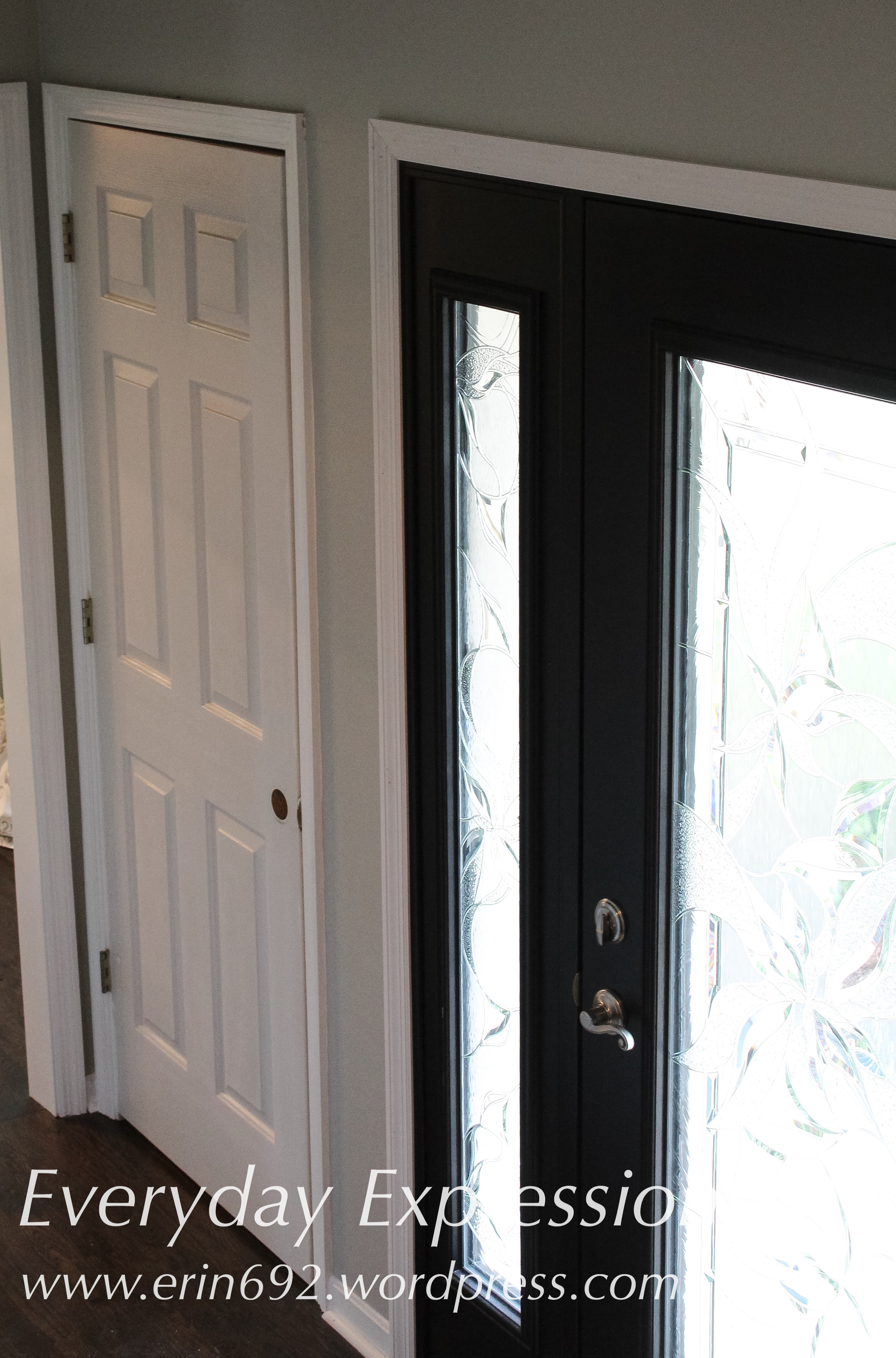 We moved into our new (20 year-old) house in March, and we have been remodeling ever since. We began by ripping up all the carpet on the first floor and laying hardwood floors. The walls and foyer ceiling are painted Behr Dolphin Fin, and it was time to update the foyer doors after the new front door was installed on Monday. The new door is black, but it’s a fully leaded door with sidelights. It lets in so much sunlight now that I knew the small area could handle the four dark doors.