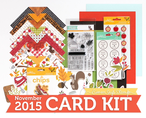 I was so excited to get this month’s card kit from Simon Says Stamps that I felt like a little kid checking the mailbox each day. And is it my imagination, or does it seem to come later each month? It was soooo worth the wait though. From the large sentiment, “So incredibly grateful for all of my blessings,” to the variety of papers and cardstocks, and finally to the cute graphics. It offers so many possibilities!