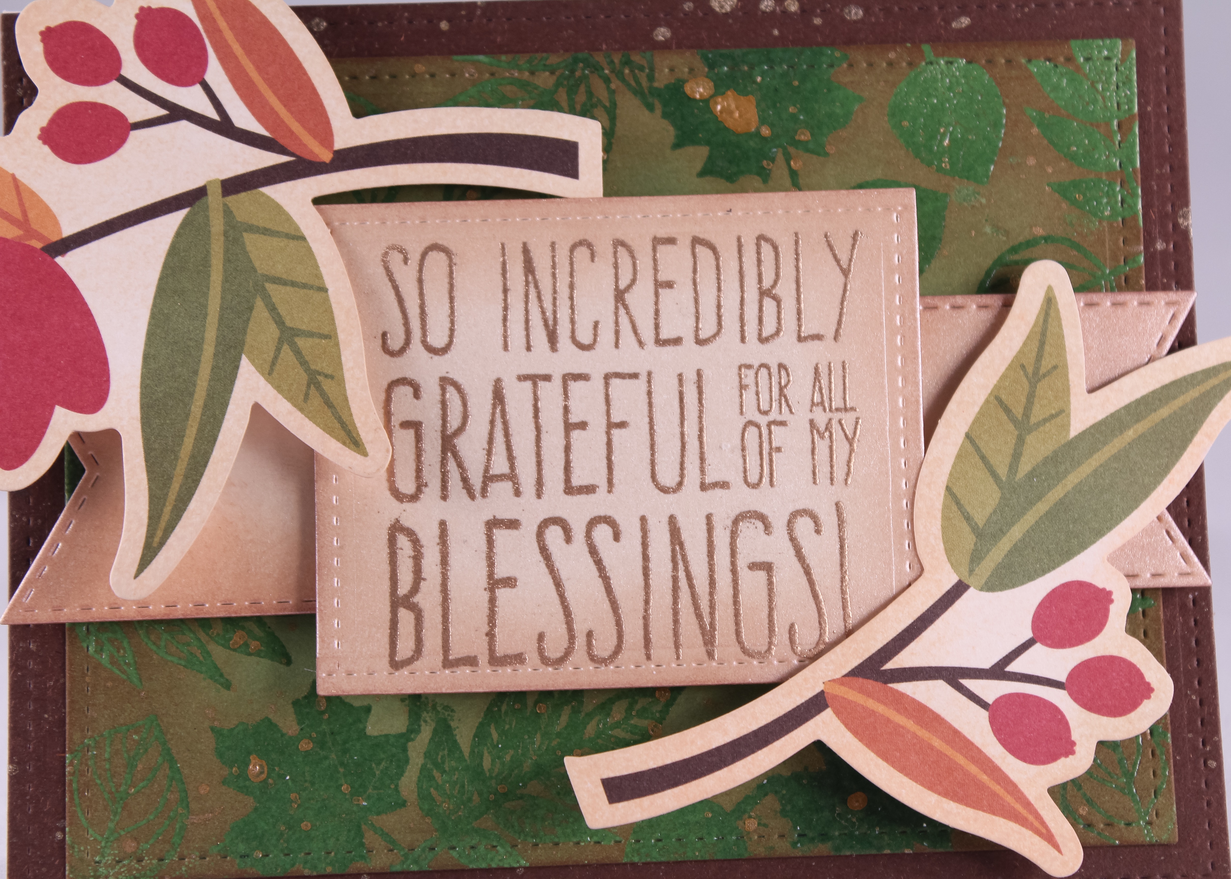 This is the first of four cards I’ve created, and I think it’s my favorite so far. I stamped VersaMark and clear embossing powder with the leaf stamps on the green card panel, and then splattered gold Distress Stain. Finally, I used Vintage Photo Distress Ink around the edges.