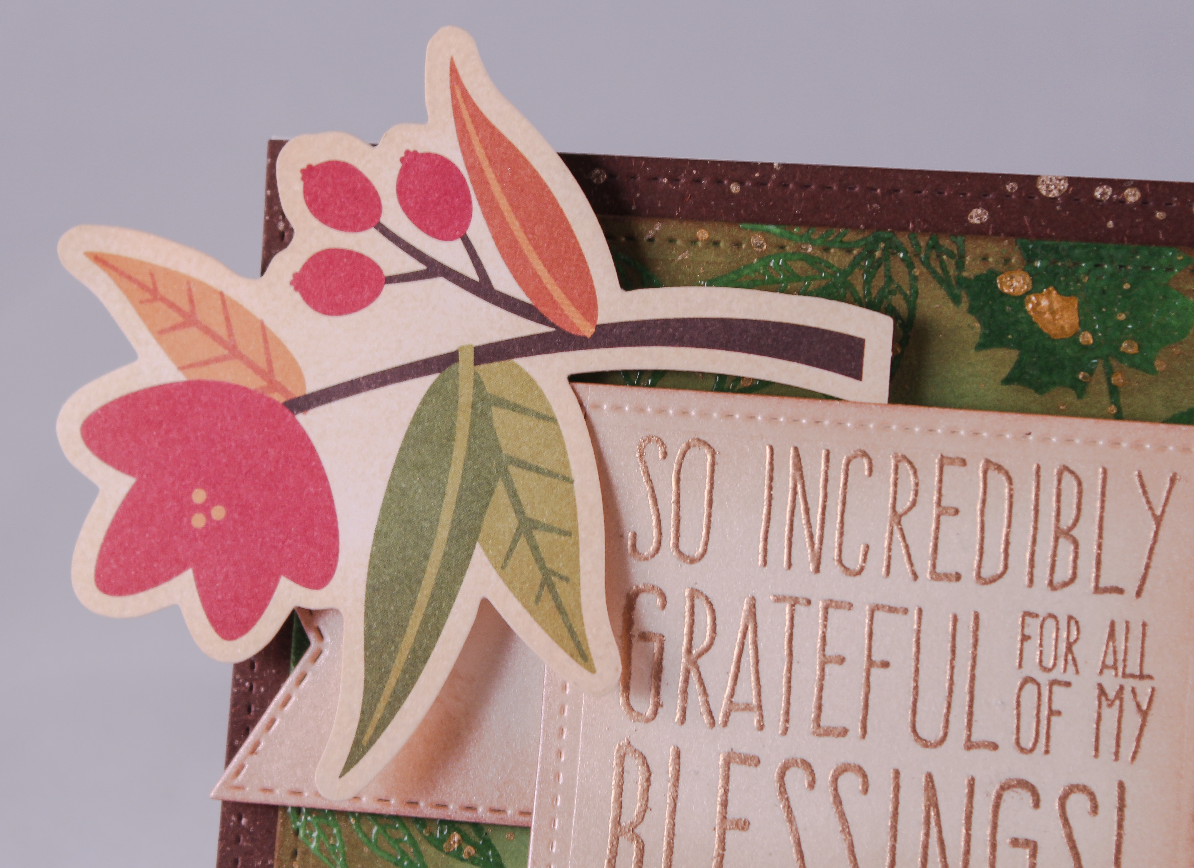 The sentiment and flags were cut from Crafter’s Companion Shimmering Cardstock using My Favorite Things stitched dies with more distress ink around the edges for a vintage look. The sentiment was stamped with gold Ranger embossing powder. In order to give the graphic cuts more dimension, I distressed those with Vintage Photo ink as well. Finally, I added Wink of Stella to the flowers and leaves for a slight bit of shimmer.
