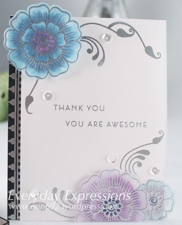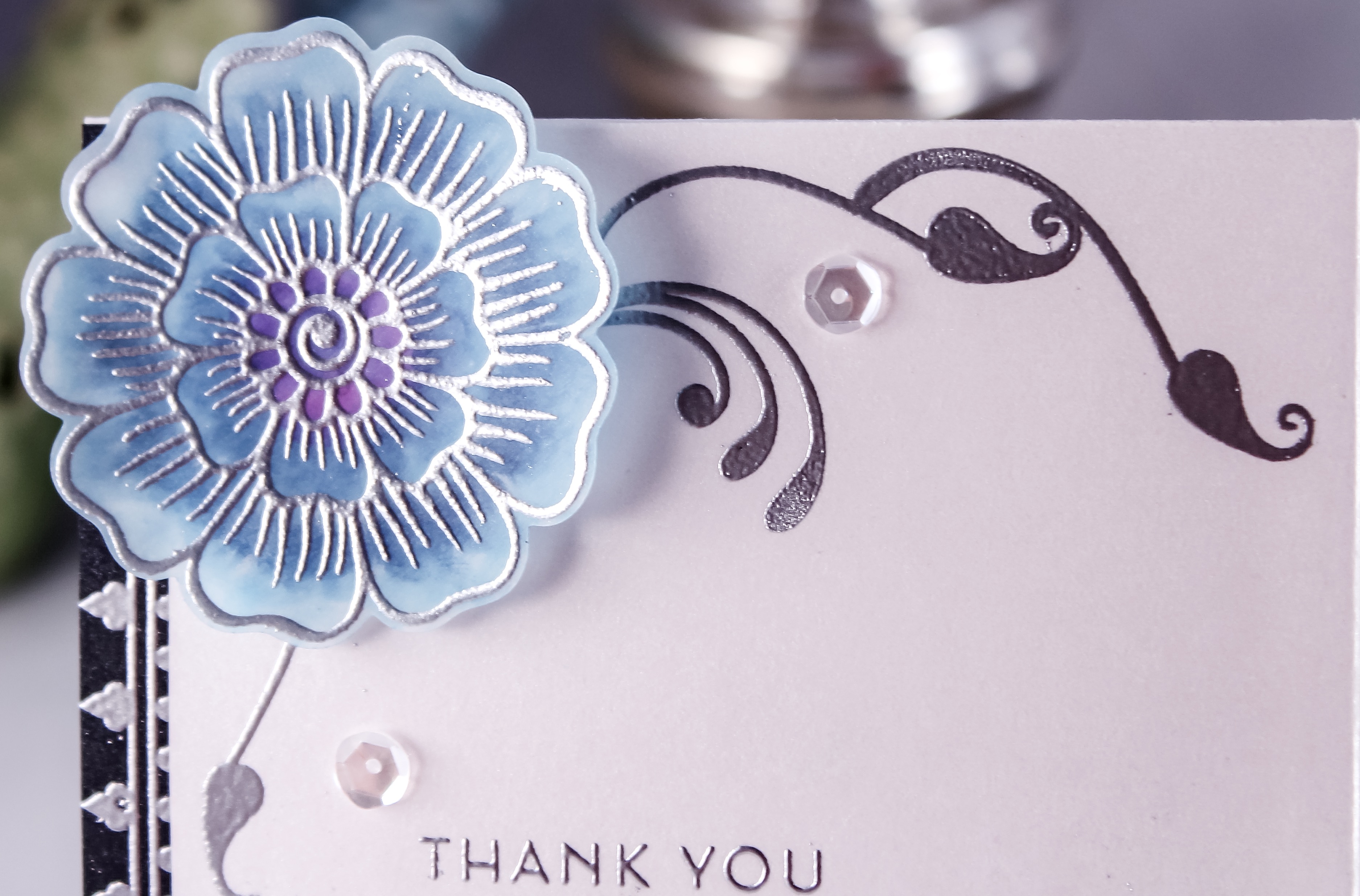 I embossed the flowers using silver Ranger on vellum and then used the matching dies to cut them out. Next I colored the back using little sponge sticks I found from Tsukineko and my new Altenew crisp inks. Just like every stamp set I see from them, I’ve been dying to order their coordinating ink sets. I finally bought the mini sets in blue, purple, green, and red. So exciting to have these gorgeous colors for this class. LOL!