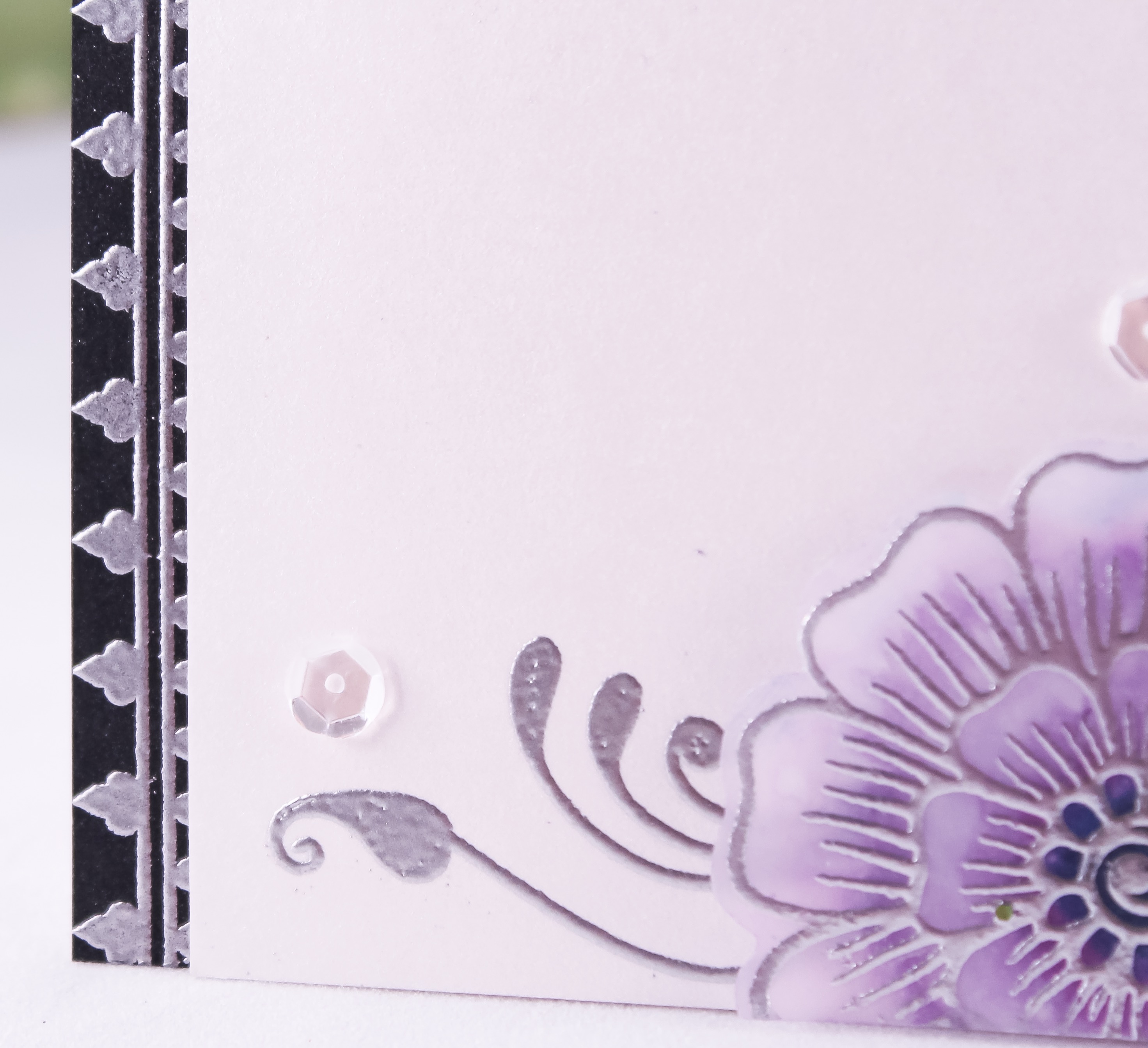 I like the look of the vines and especially the border I stamped on the black, left side. It’s one of those things you don’t notice at first because you are so attracted to the bold flowers. Then it’s like a huge, make-me-grin-from-ear-to-ear, bonus to discover the little extras in the set.