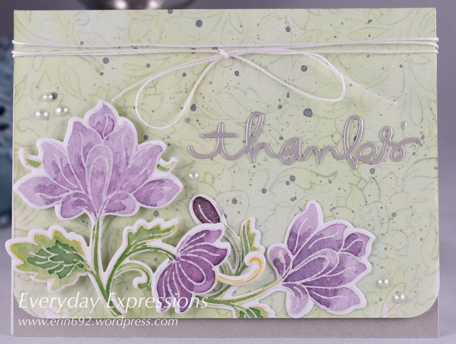 I used clear embossing on watercolor paper for the flowers, and then watercolored using Distress Inks. After the flowers dried, I die cut them with the coordinating dies, and added Wink of Stella for shimmer.