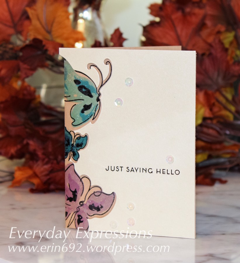 I die cut the butterflies from Crafter’s Companion Shimmering Cardstock in ivory using Altenew’s Painted Painted Butterflies set, and then used the negative space over kraft cardstock to ink the butterfly outlines using VersaMark and black embossing powder. Then I inked the layers using Altenew’s Crisp Inks. The final touch to the butterflies was to add Wink of Stella for a hint of shimmer.