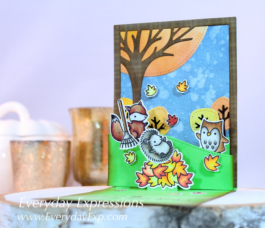 I selected the size of pop-ups I thought would work, die cut them, added a panel behind to hide the cuts, and added a stitched hillside border to add more dimension. I placed the critters and leaves (some with foam dots for even more depth), embossed the sentiment using Simon Says Stamp embossing powder, and added some vintage photo ink around the edges. (Click here for a Lawnfawn video on creating pop-up cards.)