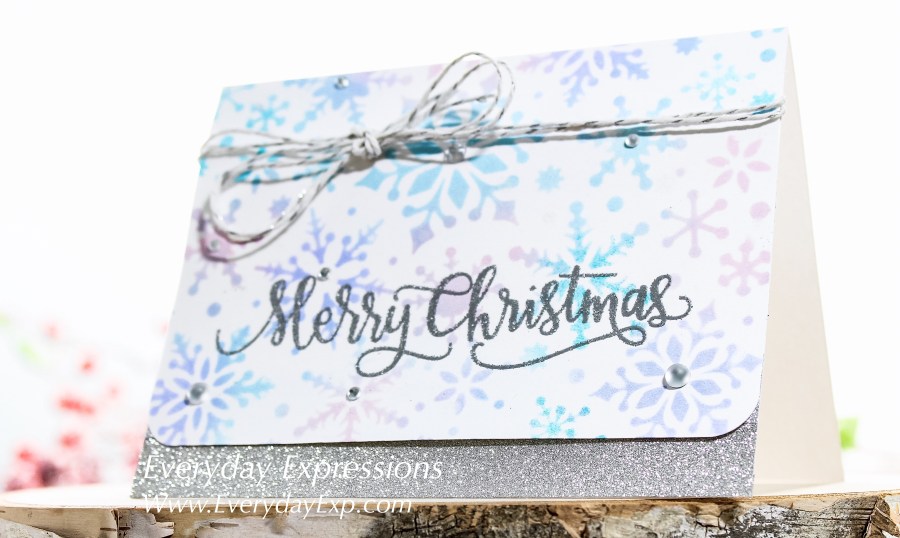 Isn’t the Merry Christmas sentiment so pretty? I love the Big Scripty Holiday Greetings from Simon Says Stamp! I completed this with sparkly silver embossing powder from Ranger. Then I trimmed the panel, cropped the corners, and glued onto a base card that was trimmed with silver, sparkly washi tape. Next I added Lawn Fawn Trimmings silver sparkle cord, and finally pearls and rhinestones in the snowflakes for a final blingy touch.