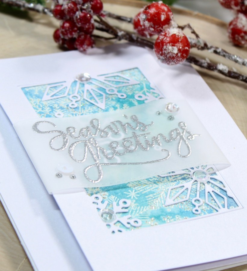 The SSS snowflake die was cut from my favorite shimmering white cardstock, and then inlaid back into the card placing it over the background. I stamped and embossed the sentiment onto vellum paper, and wrapped it around the panel. Next I used craft foam to add dimension, and glued it onto the background and card base.