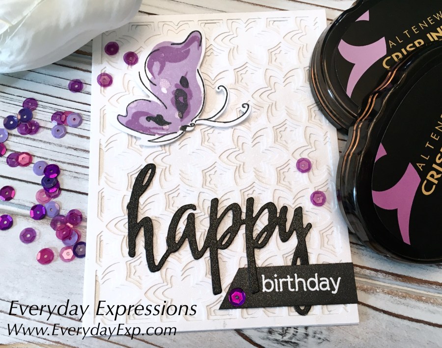 The dies are so intricate that everything else is very simple! My favorite Painted Butterflies set from Altenew stamped with purple Crisp Inks and Versafine black ink. (Here’s a card set I created with this stamp set.) The sentiment die and stamp are Altenew Halftone Happy. (Here’s another card set I created with halftone dies and stamps.) Finally I sprayed everything with Shimmer Spritz, and added Doodlebug lilac sequins for bling.