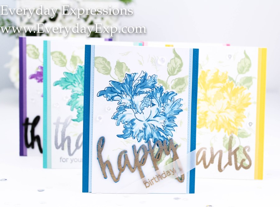 The MISTI (Most Incredible Stamping Tool Invented) helped make the production of these card sets so much easier than trying to eyeball the alignment of the layering stamps! Once you place the first stamp, it’s a cinch to stamp the rest of the cards. I always begin with the solid flower in the lightest color, followed by the mid-tone, and then the darkest.