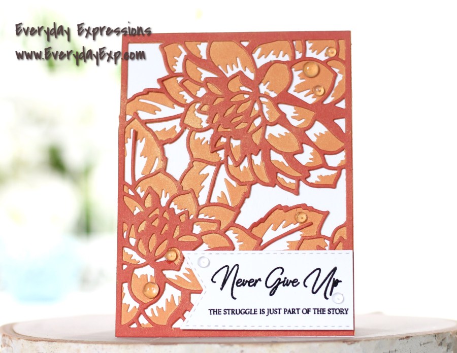 The application and style of card lends itself, along with the colors, to impart the message. Everything associated with this card is strong and bold to me. The Dahlia is a big, strong flower. The Altenew design of the Layered Floral Cover dies are bold. The colors are daring. The message from the Never Give Up stamp set says it all!
