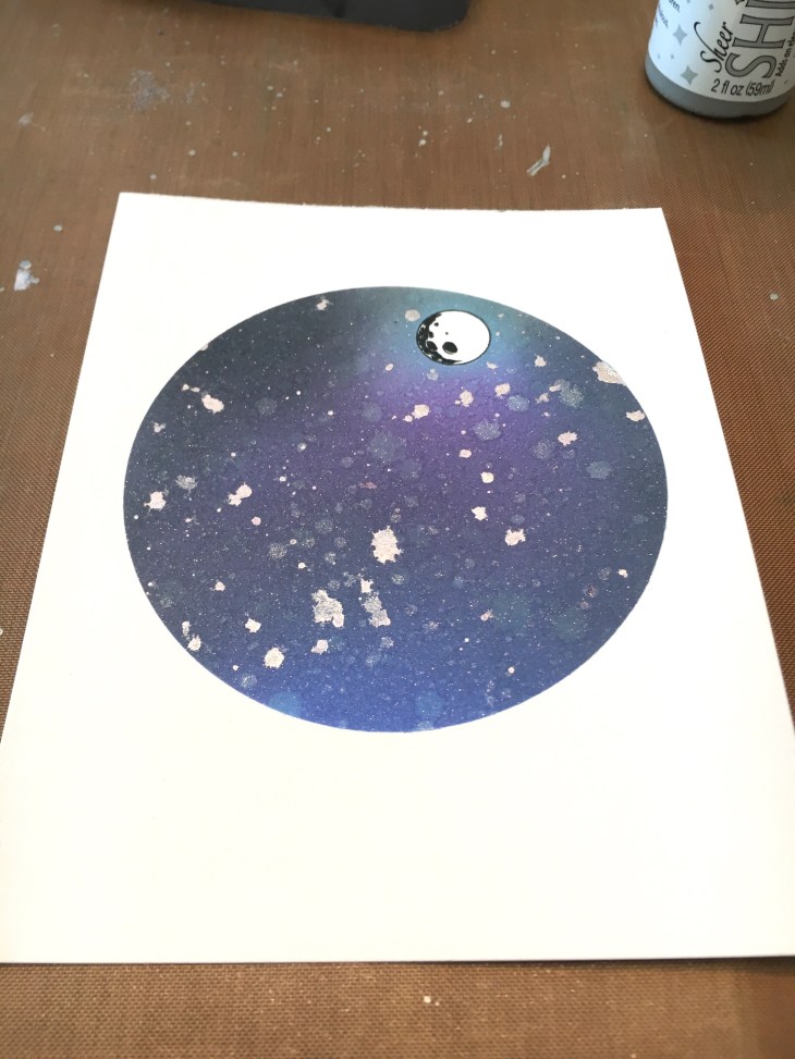 I began by die cutting a circle from masking paper, and placed the negative piece over a watercolor panel. Then I stamped and fussy cut a moon from the masking paper and placed it in the circle. Next I blended Broken China, Chipped Sapphire, Wilted Violet, and Black Soot Distress Inks, and then spritzed and lifted water to create the night sky. Finally, I Splattered Brushed Pewter Distress Spray Stain, and sprayed Shimmer Spritz for stars. (For further details on how to create a galaxy card, click HERE.)