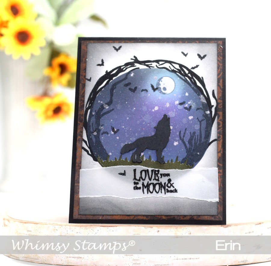 Hi Everyone, and welcome back to my craft room! This is my favorite week of the month; That’s right. It’s Whimsy Stamps‘ Release Week! Today I’m sharing a card created using the new Howling Night stamp set, and, oh my, it is awesome! I had a blast creating this card.