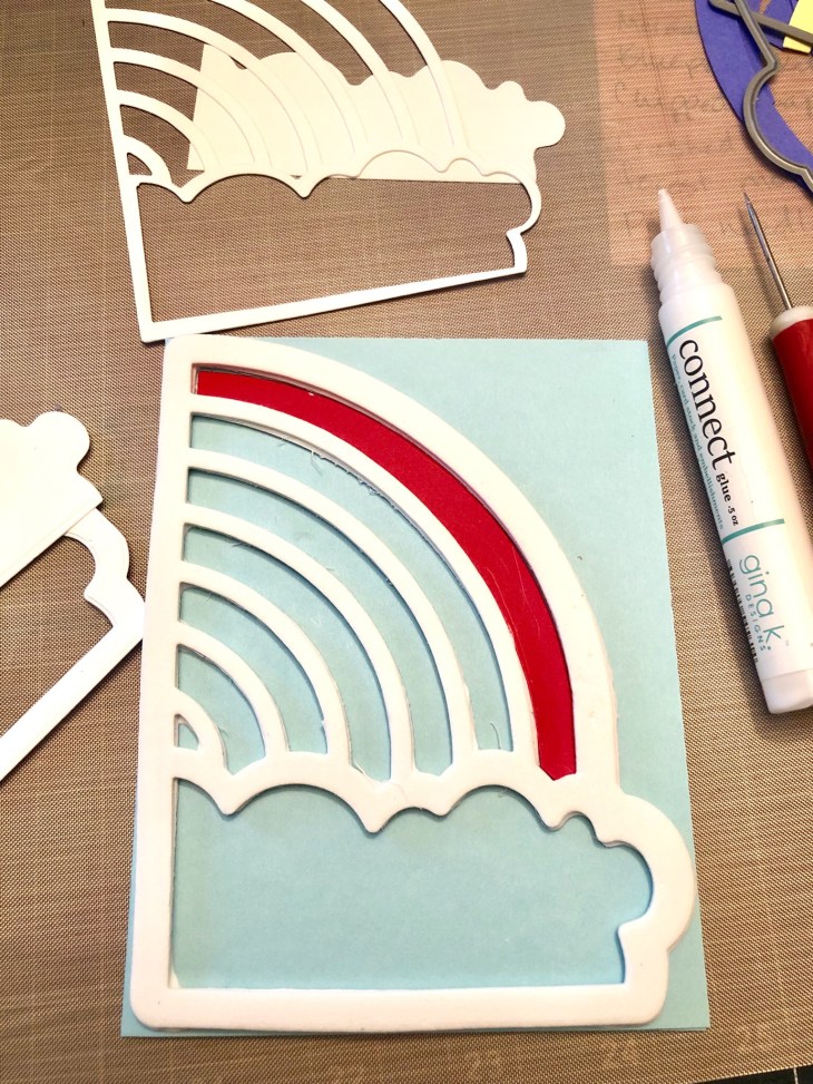 I began by die cutting all of the rainbow colors and the white outlines from cardstock. Then I cut the frame from craft foam twice so that I could have deeper channels for the shaker beads. (HINT: If your shaker cards don’t have much movement or the beads get stuck, it’s usually because it doesn’t have enough room to move easily. Try doubling the thickness of the foam for better shakability!) I used Gina K. Connect glue, and I love how easy it was to adhere everything to the light blue card base.