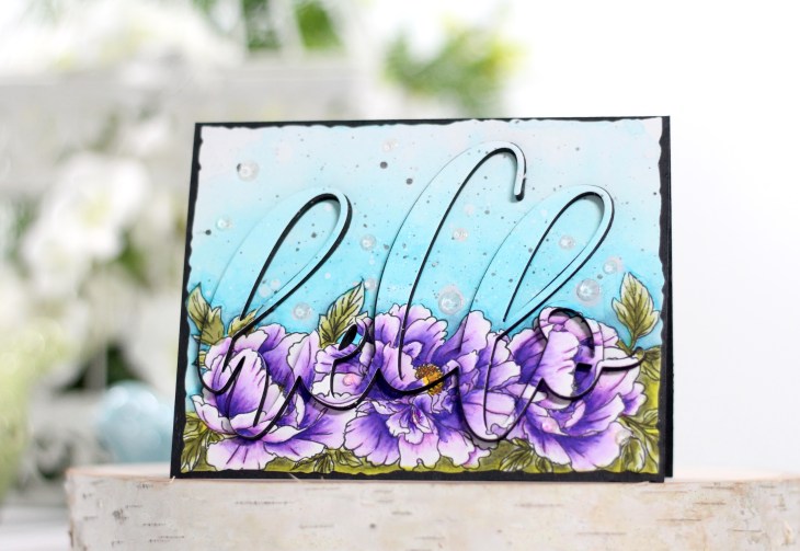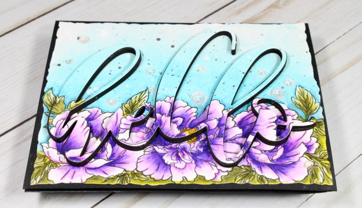 I die cut the hello mega die sentiment from the watercolored panel, and then cut it twice from black craft foam before adhering all of the sentiments together using Gina K. Connect glue. Next I taped the background onto a black card base, and replaced the foam-backed hello sentiment into the card to create an eclipse effect. Finally, I added jewels from Pretty Pink Posh for extra bling.
