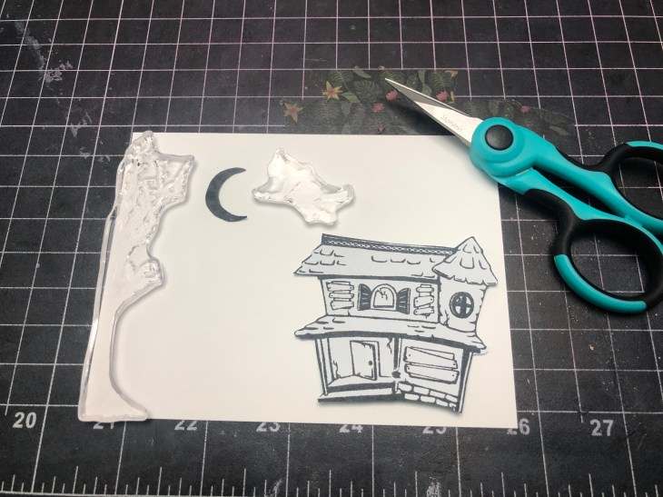 I began by stamping the house and moon on Inkadinkadoo masking paper, and then fussy cut them both. Then I planned where I would stamp everything, placed my masks on Neenah Solar White 80 lb. cardstock, and began blending Catherine Pooler inks onto the scene. (For an in-depth video on creating this spooky night sky on a previous card, click HERE.)