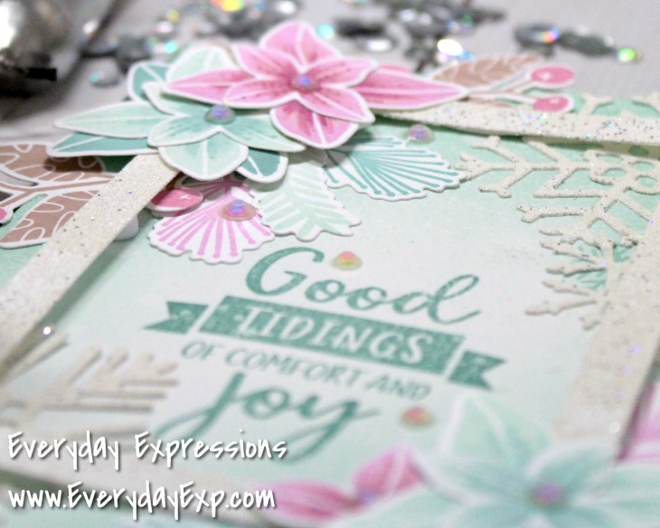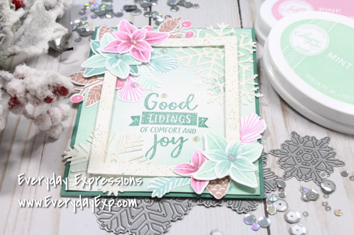 Hi Everyone, and welcome back! I am excited to share this card that we created together during last week’s Facebook Live using several Catherine Pooler products and inks. I am thrilled with how this turned out! Minty green and pink is one of my favorite holiday color combinations right now, and all of the layers with the stamped and die cut images create a dramatic effect. What do you think?