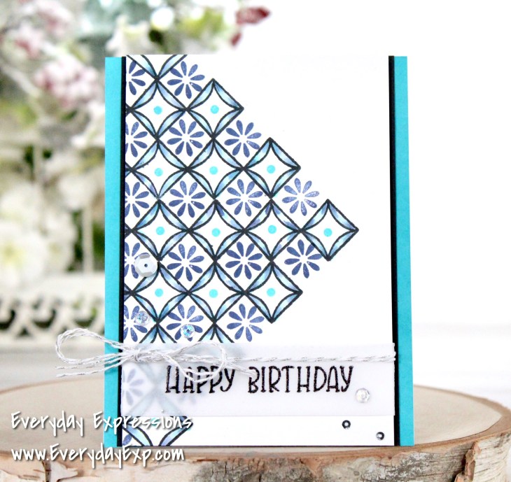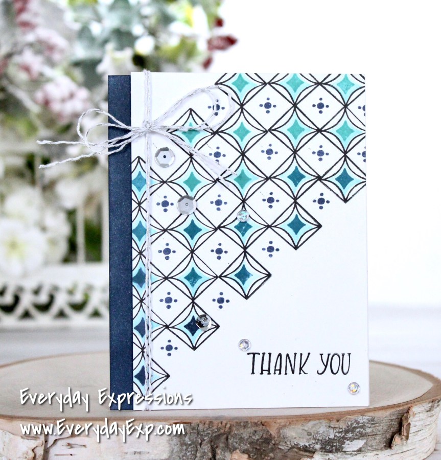 How cute are these two cards? Oh so quick and easy to create too! This stamp set had several pieces that you stamp to create pretty patterns. I just placed the primary diamond strip in the MISTI and moved the cardstock to stamp it multiple times in the pattern I wanted using Midnight archival ink from CP. Next I used the smaller stamps on blocks to stamp in the details. I tried to create an ombré effect on this one with Juniper Mist, Aquatini, and Fiesta Blue inks, and then I created a Juniper Mist border for this card as well.