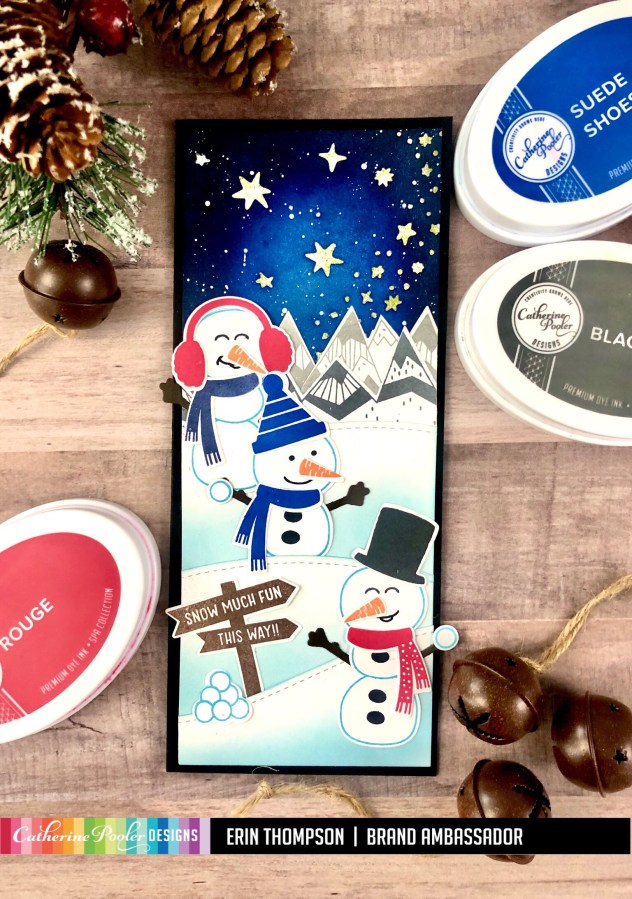 Hi Crafty Friends, and happy January! Today I’m sharing a wintery, slimline card created with several Catherine Pooler Designs products. How fun is this cute scene? I love how these adorable Build A Snowmen stamps and Mountain Of Thanks stamps (from the Out West Collection) paired so well with the Starry Night Cover Plate die.
