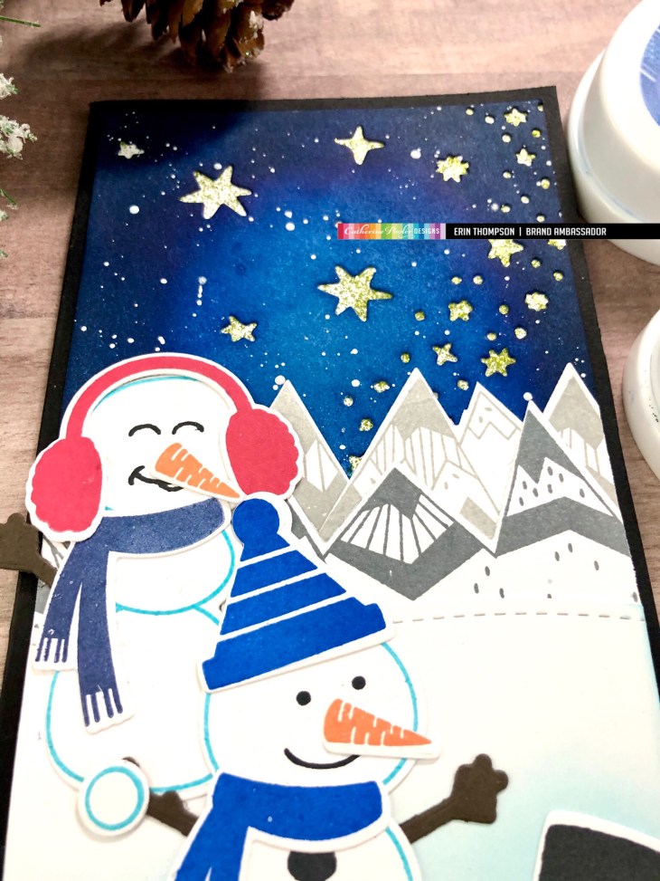 I blended It’s A Boy, Suede Shoes, and Juniper Mist on Bristol Strathmore Smooth cardstock, and then die cut using the Starry Night cover plate die. Then I spread Stickles over CP cardstock, and adhered the die cut night scene over the glittery panel. Next I stamped all of the snowmen and mountain pieces using Catherine Pooler inks and cardstock. After all of the stamped pieces were die cut, I softly blended It’s A Boy ink onto three snowbank die cuts.