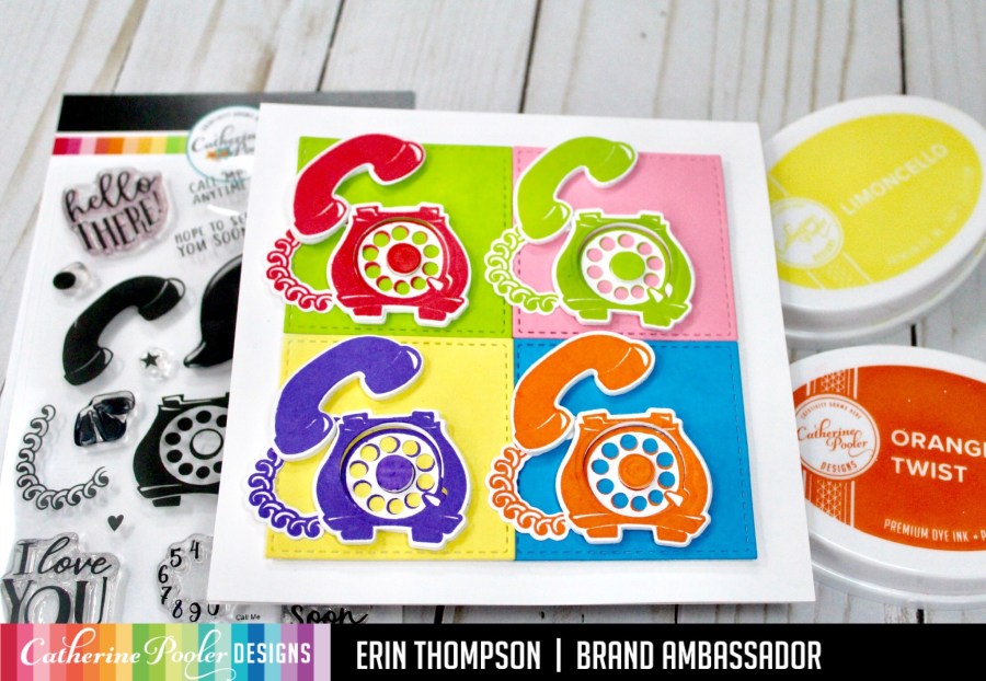 I thought it would be so fun to create a “Pop Art” Call Me card in the iconic style of Andy Warhol. Also, this card was inspired by the talented Jennifer Rzasa of Our Change of Art Blogspot, and a card she created a while back in the Pop Art style. I stamped the four phones in Catherine Pooler inks, and then die cut the pieces. Next I cut four stitched squares from CP white cardstock, and directly inked the squares with ink pads for a saturated background panel.