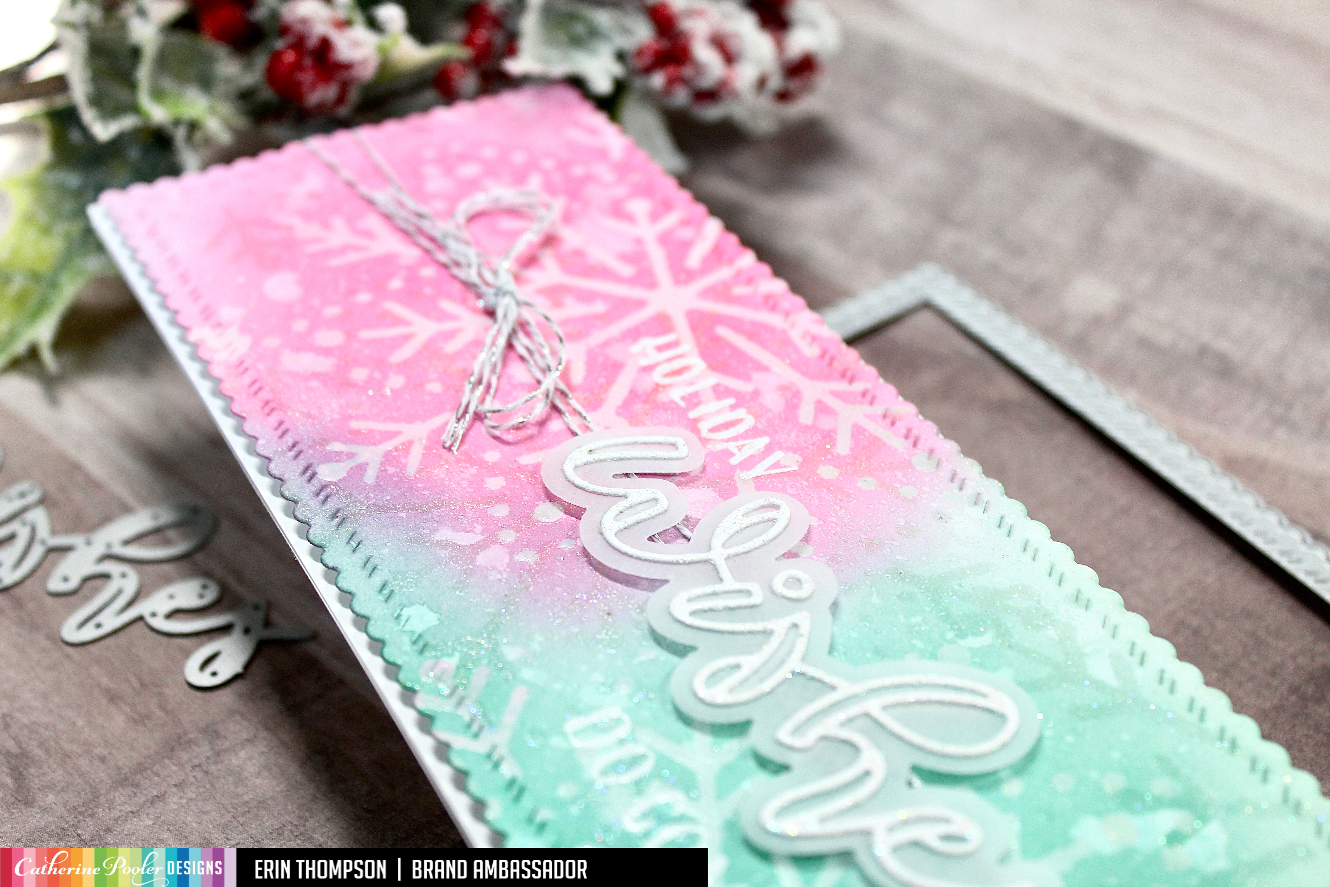 I adore the colors of pink and mint green for Christmas, and I think they look so pretty ink blended here with this emboss resist using clear WOW embossing powder with the new Snowflake stencil.