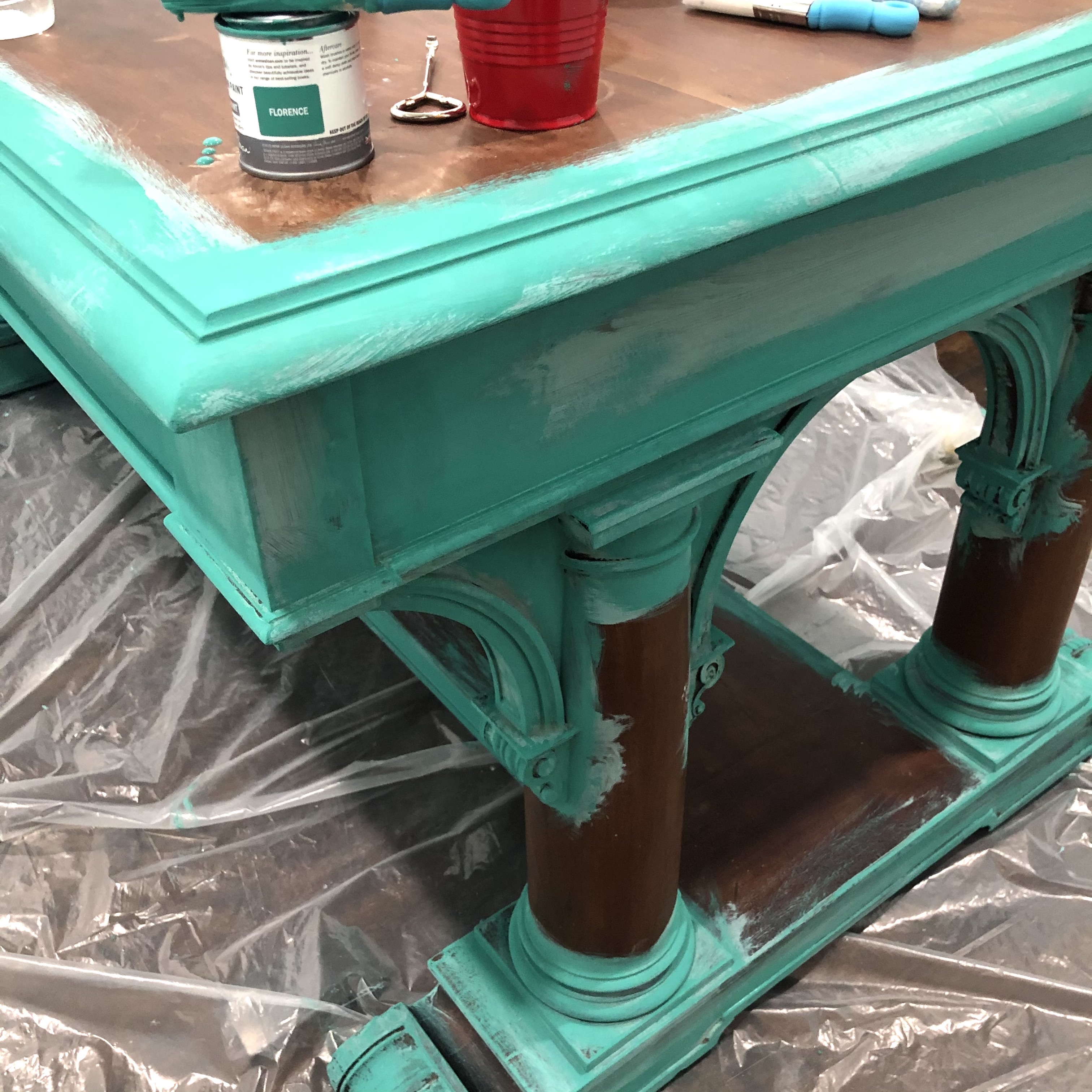 Step 4: Slap a coat of Florence right over Provence. Note: I do not cover the lightest color in specific highlighted areas. See the drawer fronts. (Yes, this looks really bad before it gets better.)