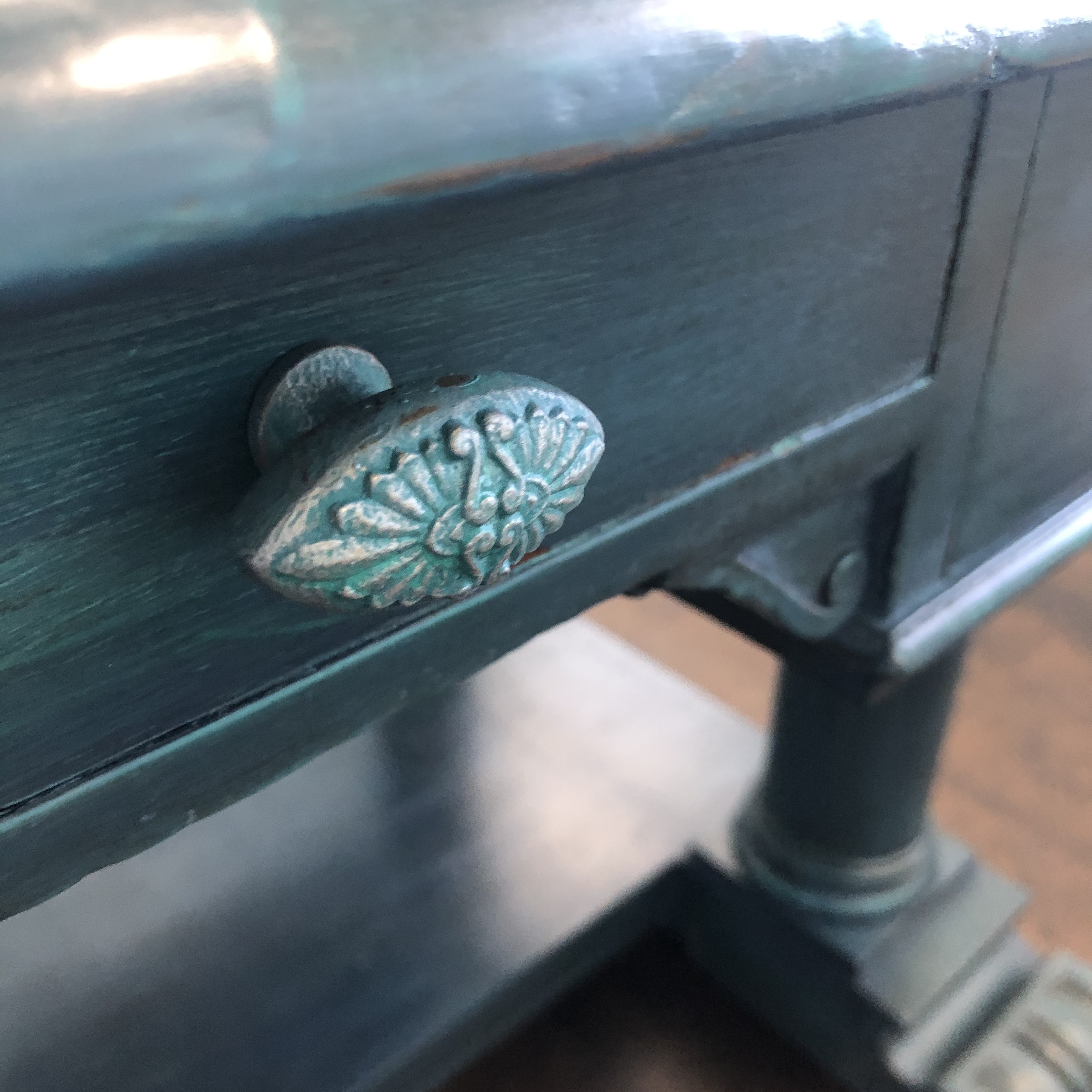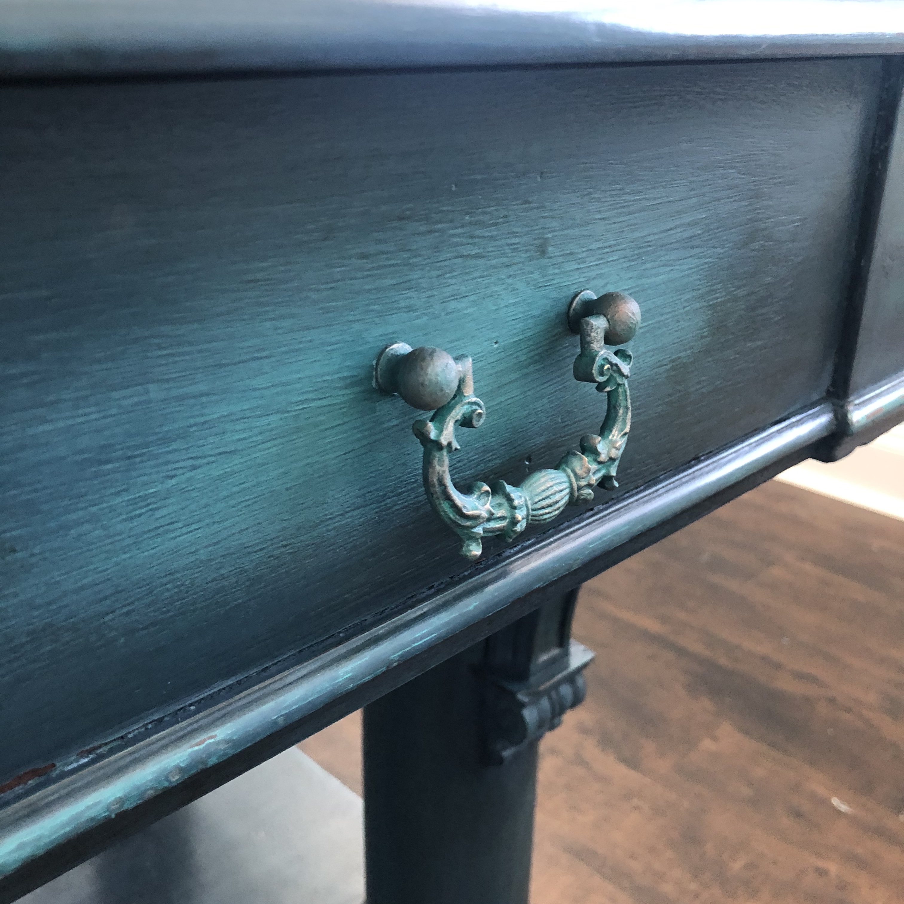 Some people prefer just a soft, clear coat of wax gently buffed. I wanted the aged, grungy look of an old patina for this desk, and added the dark wax shown in the second picture.