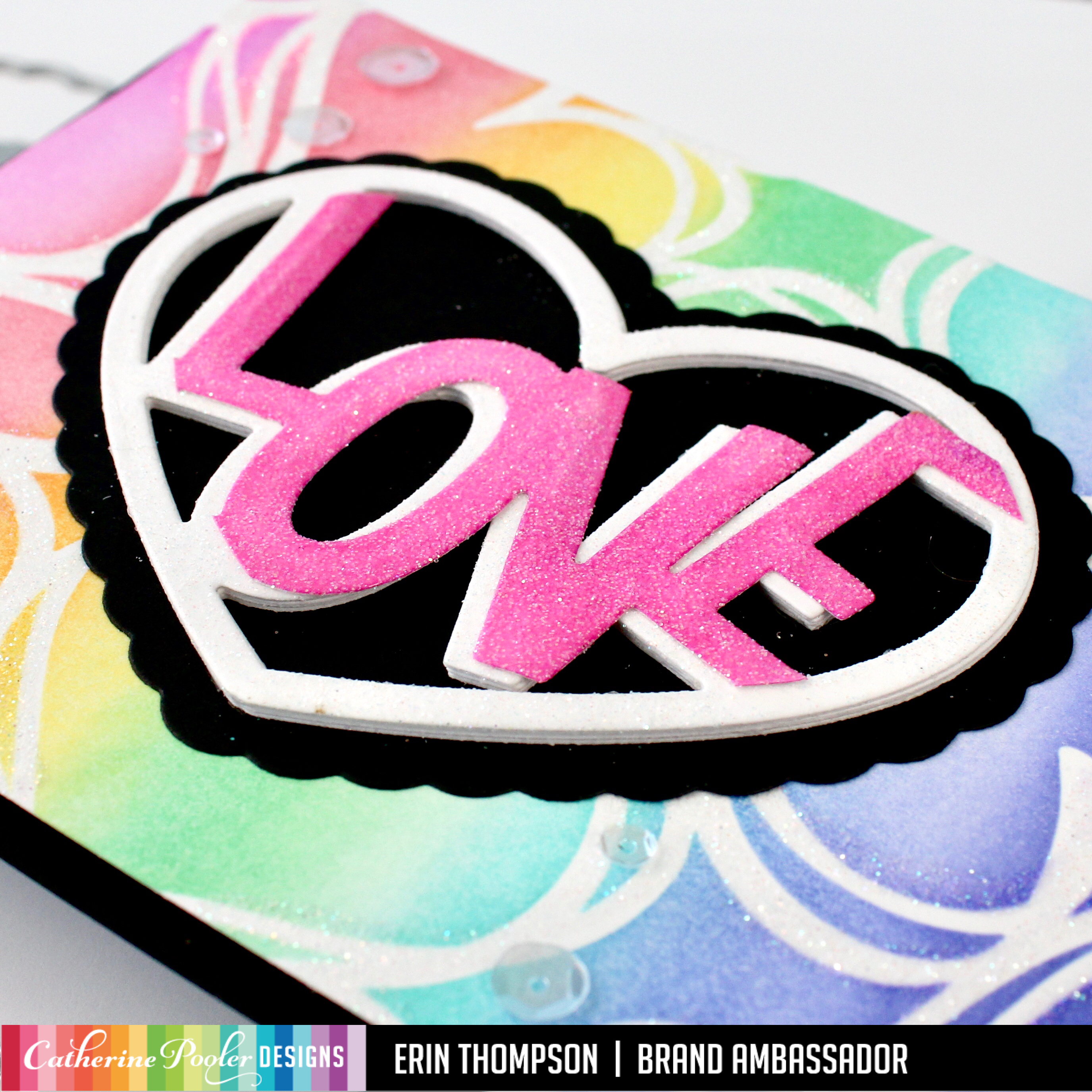 After the demo, I decided to die cut several of the Love die cut to create dimension. Then I cut the Love from one heart, inked it with Pucker Up, and then used WOW Halo embossing powder for extra color and sparkle. Finally, I decided to offset it in the final layout for interest, and added Crater Lake CP sequins before layering onto a black card base.