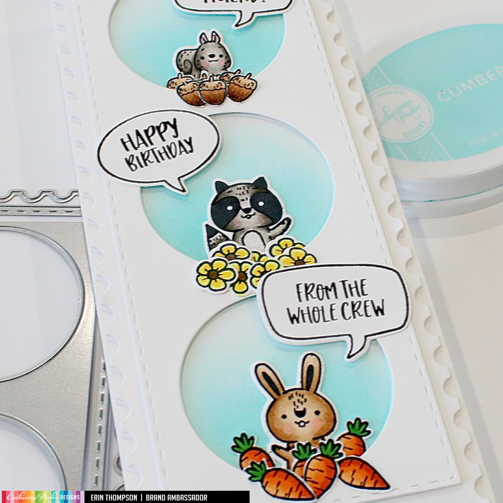 Hey Everyone, and welcome back! I hope you are well, and friends and family are healthy too. Today I’m sharing an adorable slimline card I created with the new Party Crew stamps from Catherine Pooler. How cute are these Copic colored critters?