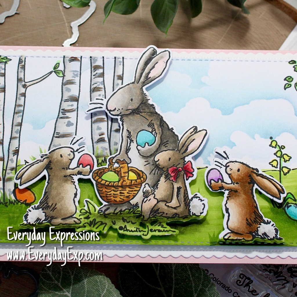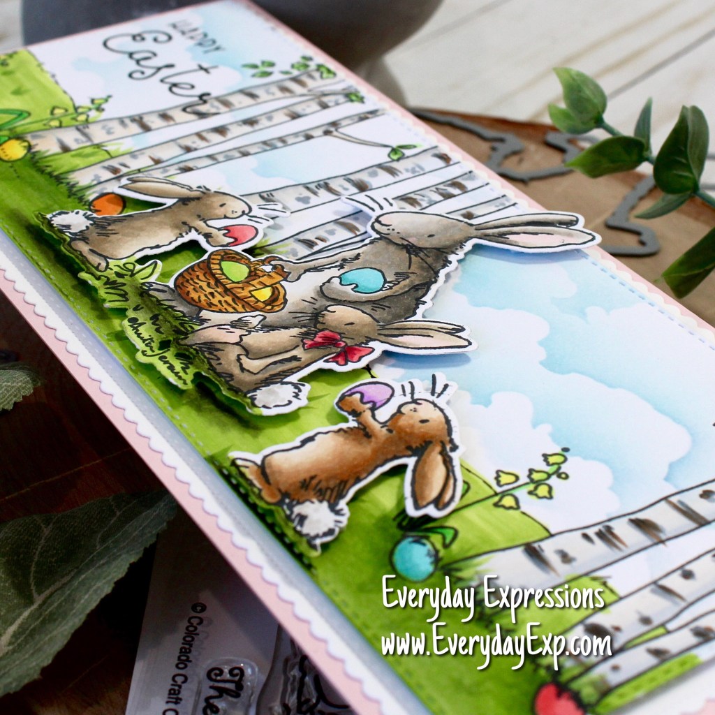 What do you think? Isn’t this an adorable Easter card? I am having so much fun with these Colorado Craft Company bunny stamps! This stamp set is currently sold out, but 3C told me that it should be restocked tomorrow (March 8th). Thanks for hopping by! Love and artsy hugs!