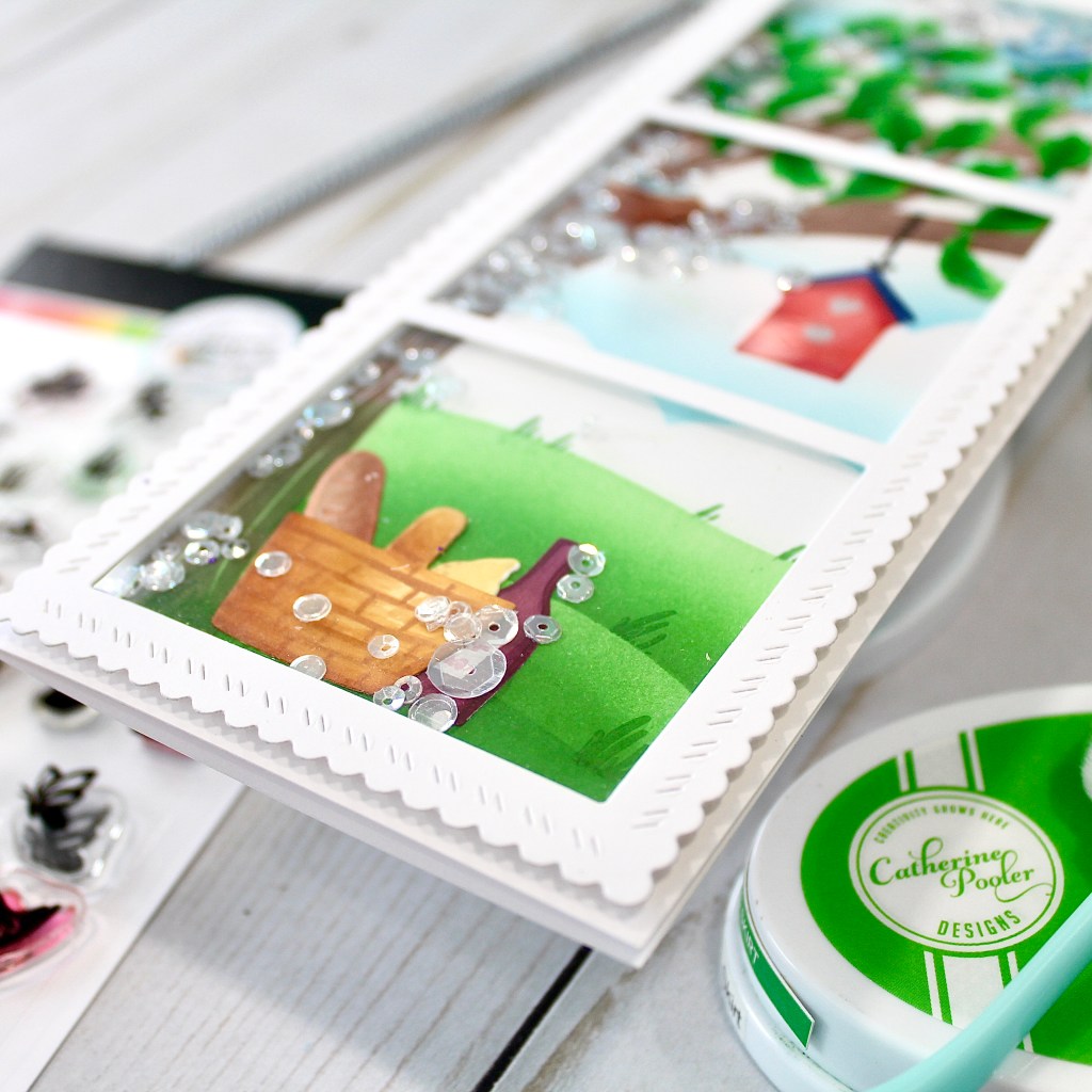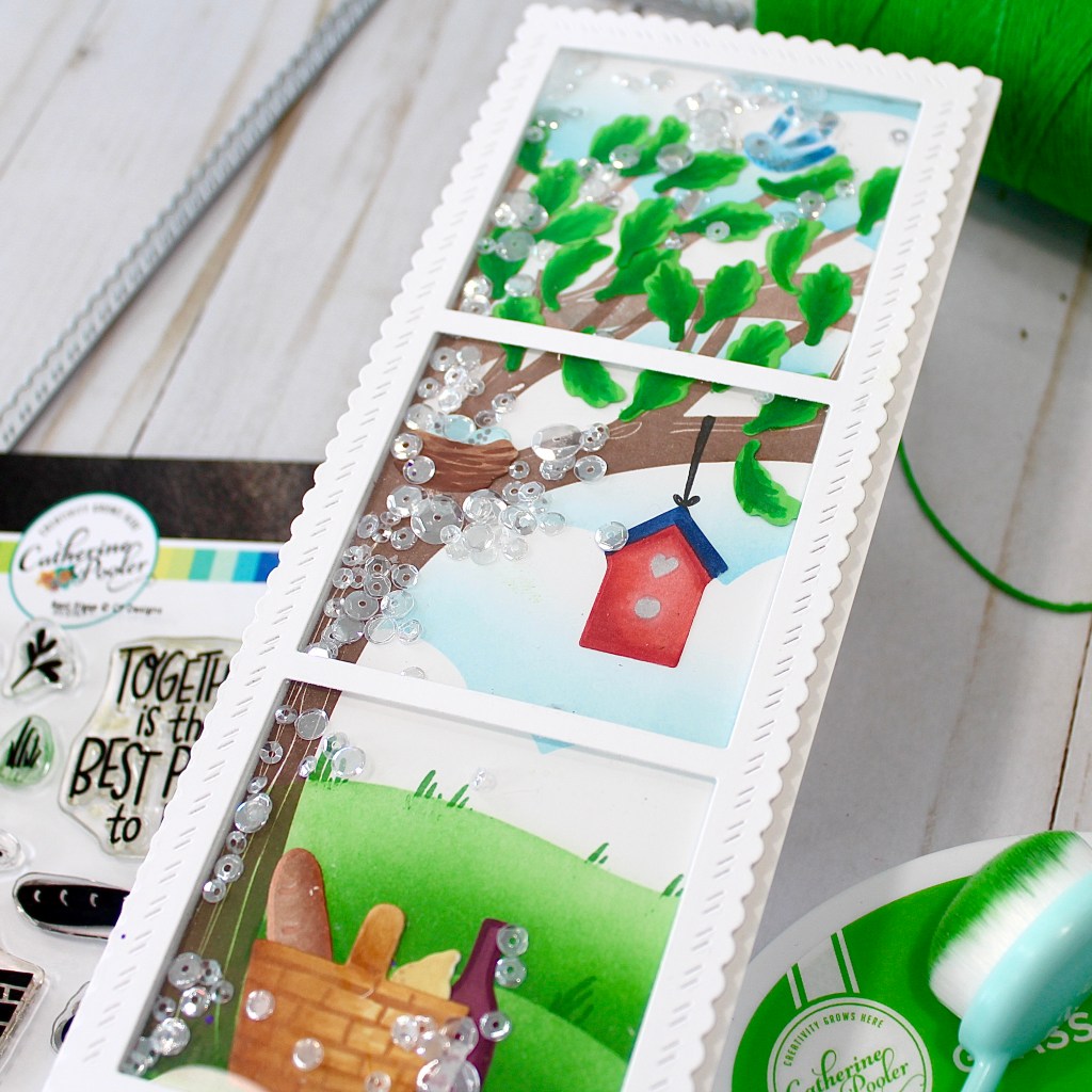 I couldn’t wait to share this fun slimline shaker card! How cute is this new Best Place stamp set that pairs perfectly with the Old Oak Tree Background stamp? This completes the final seasonal stamp set for the tree background, and it is a perfect spring scene.