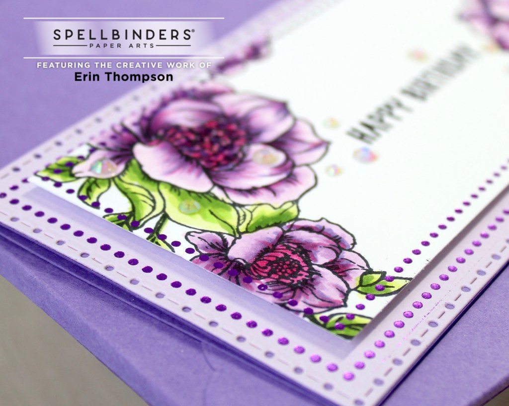 This month’s Glimmer Hot Foil Club features several nested mini slimline dies, and rose gold foil. I used a vibrant purple Spellbinders foil for this card as it coordinated with my violet theme I’ve used on all of my cards. (You can find the card for the Large Die Of The Month Club HERE.)