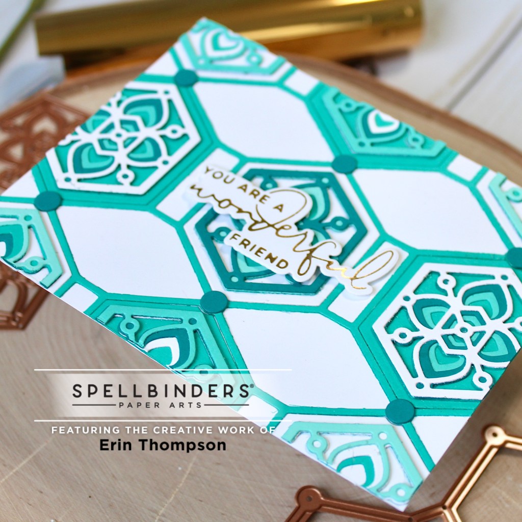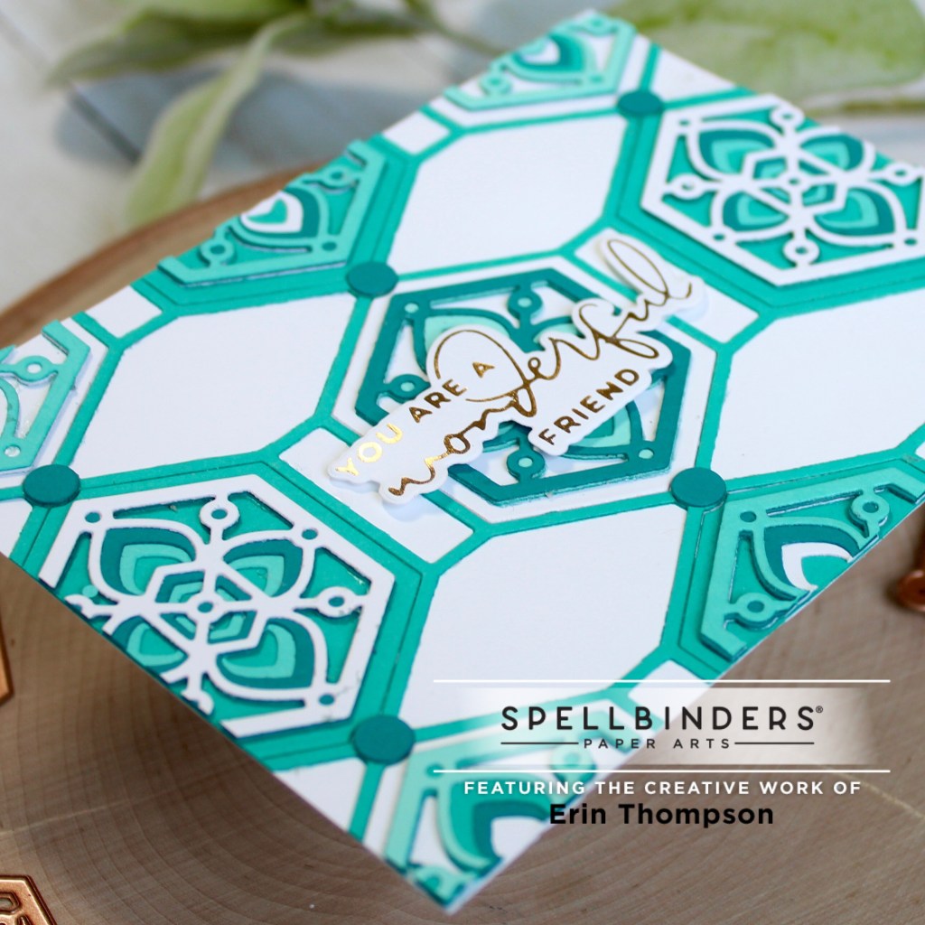 Hi Everyone, and welcome back! Today I’m sharing a pretty card I created with the new Spellbinders’ Paper Arts Small Die Of The Month Club Kit. The Hex Kaleidoscope Tile Small Die is perfect for so many different card sizes and styles.