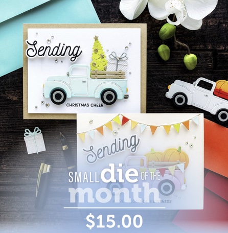 I adore the look of the old pick-up truck in this month’s kit. It’s fun that it is a layered die, and you can pop-up the fenders with foam tape if you want to add extra dimension.