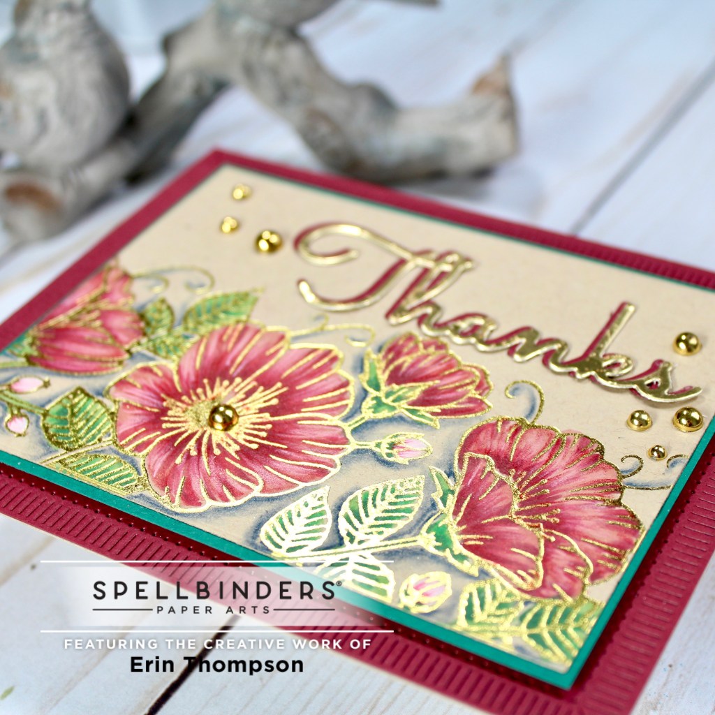 I took advantage of the Spellbinders’ buy one, get one sale a couple of weeks ago, and found this gorgeous Sweet Blooms Border Glimmer Hot Foil plate. I paired it with the new Fluted Classics Rectangles and Sweet Sayings Notecard Sentiments by Becca Feeken.