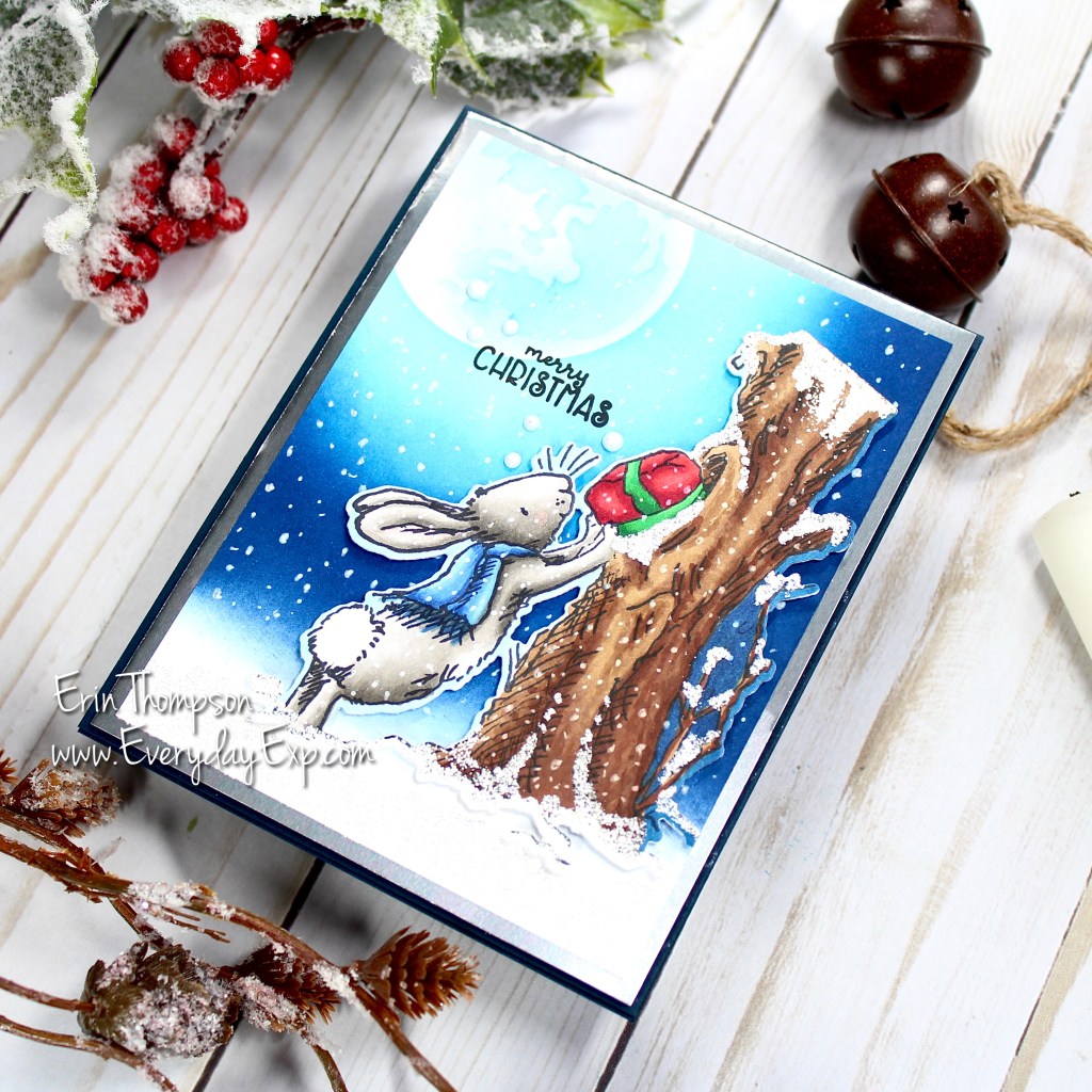 I decided to have this cutie hiding last minute gifts late on Christmas Eve under a gorgeous moonlit night sky. In both scenes I added snow with WoW embossing powder applied with an embossing pen. Then I added snowfall with a white gel pen.