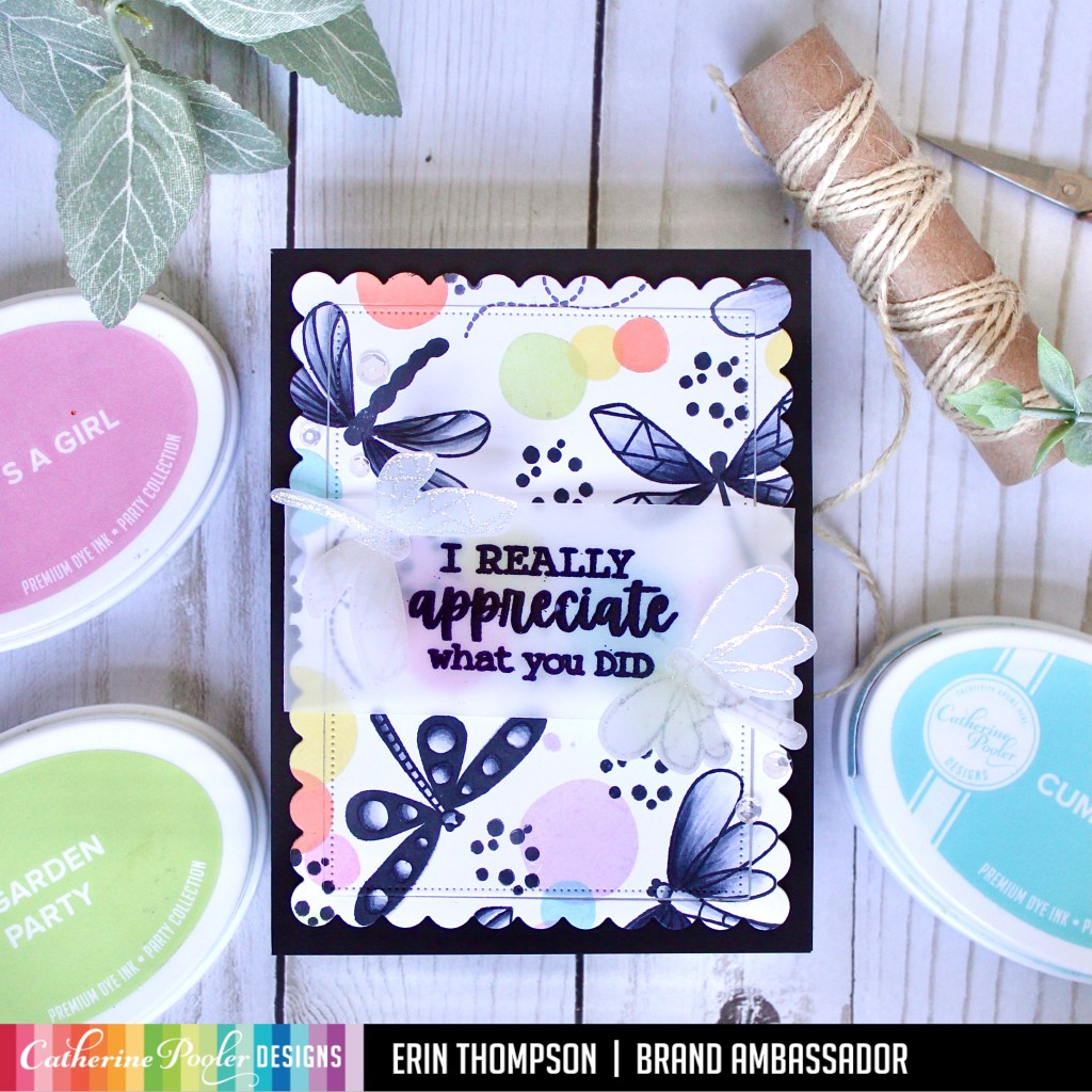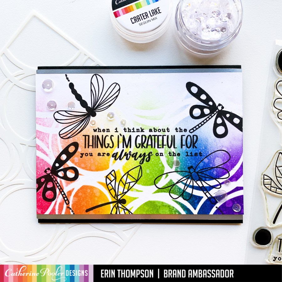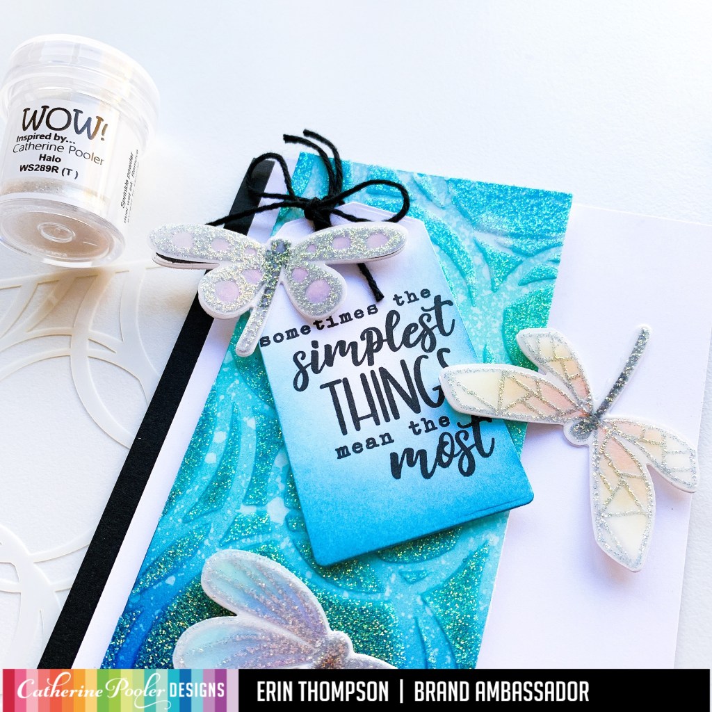 I couldn’t resist using WOW Halo embossing powder on the vellum wings of these die cut dragonflies. I created the background by ink blending and then using Nuvo Glimmer Paste in Moonstone through the stencil. Can you ever have too much sparkle on a card?