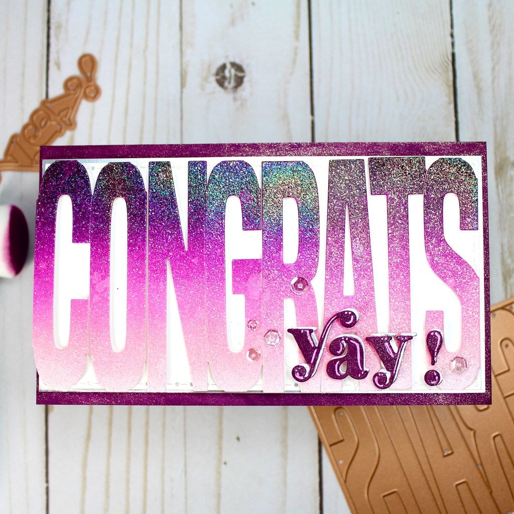 Today I’m sharing the Congrats die from the new Spellbinders’ Paper Arts Be Bold collection. I ink blended Catherine Pooler inks in It’s a Girl, Pucker Up, Flirty Fuchsia, and Glam on white cardstock for an ombré effect, and heat set the ink. Then I used WOW embossing ink over the entire mini slimline panel, covered it with Halo embossing powder, and then heated it before running it through the die machine with the CONGRATS die.