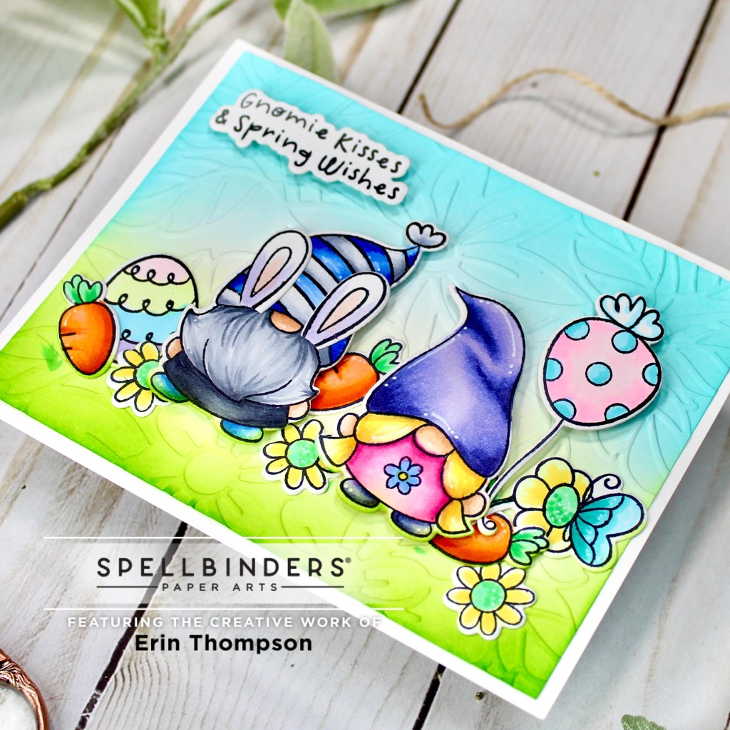 How adorable is this month’s Clear Stamp and Die set? Oh my goodness! That little gnome couple and his adorable rabbit ears! I think I squealed when I opened this cute stamp set, and I couldn’t wait to Copic color them. I also used the March Embossing Folder for the background. It adds such a fun, textured, spring look.