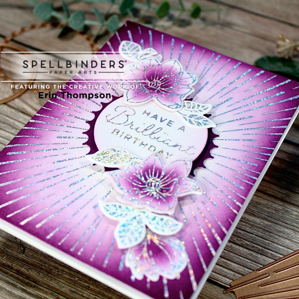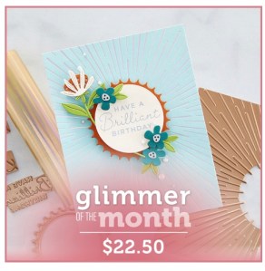 As you know, I’m obsessed with the Glimmer Hot Foil Machine, and the Glimmer of the Month Club Kit. This month’s hot foil dies do not disappoint. The large plate offers so many design possibilities. Here I foiled it twice to cover the entire A2 card with the focal point in the middle. However, you could just foil it once for many other card designs.