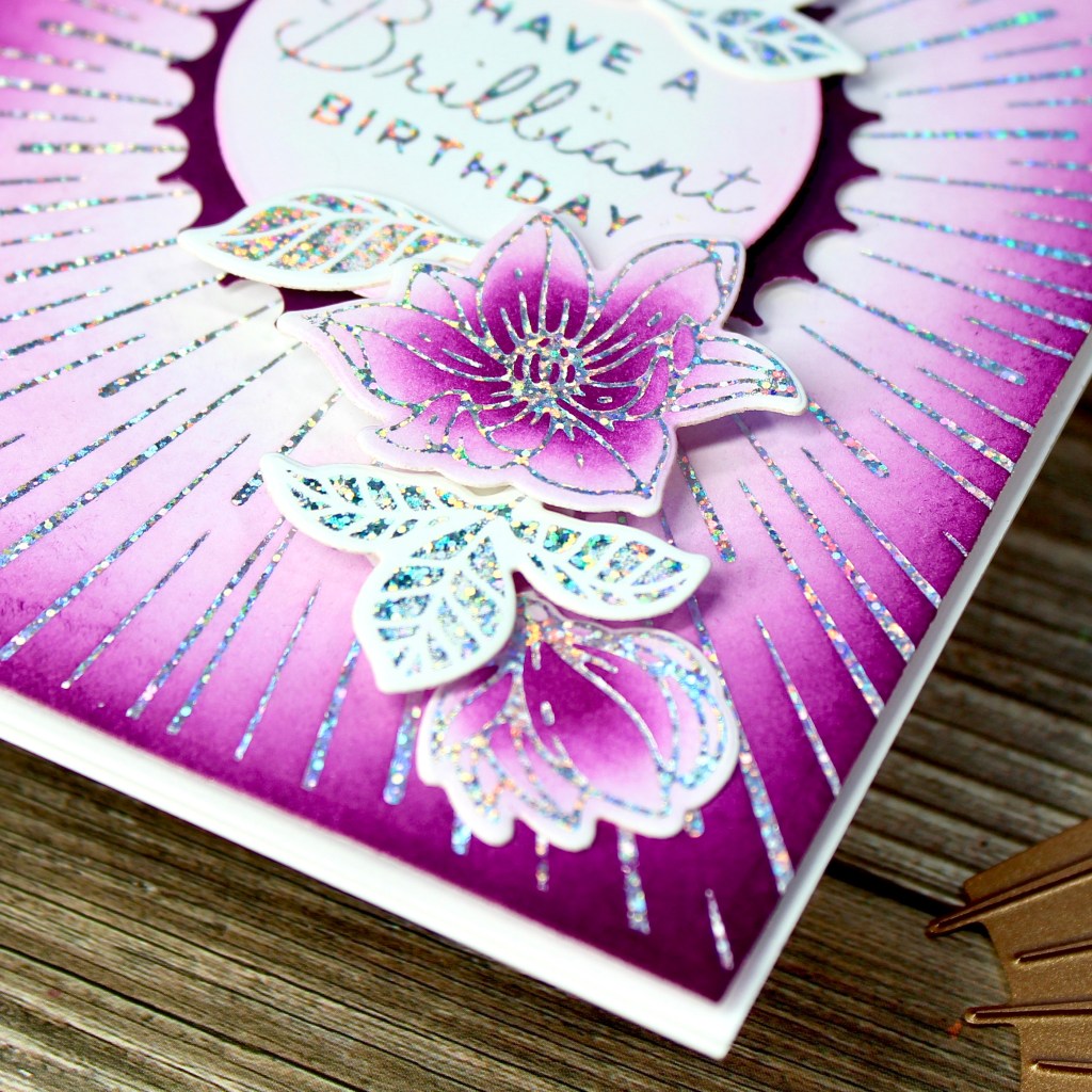I foiled using Silver Holographic Speckle from the multi pack, and it does sparkle so much! After foiling, I ink blended using Catherine Pooler inks, and then gently buffed the excess ink from the foiling.