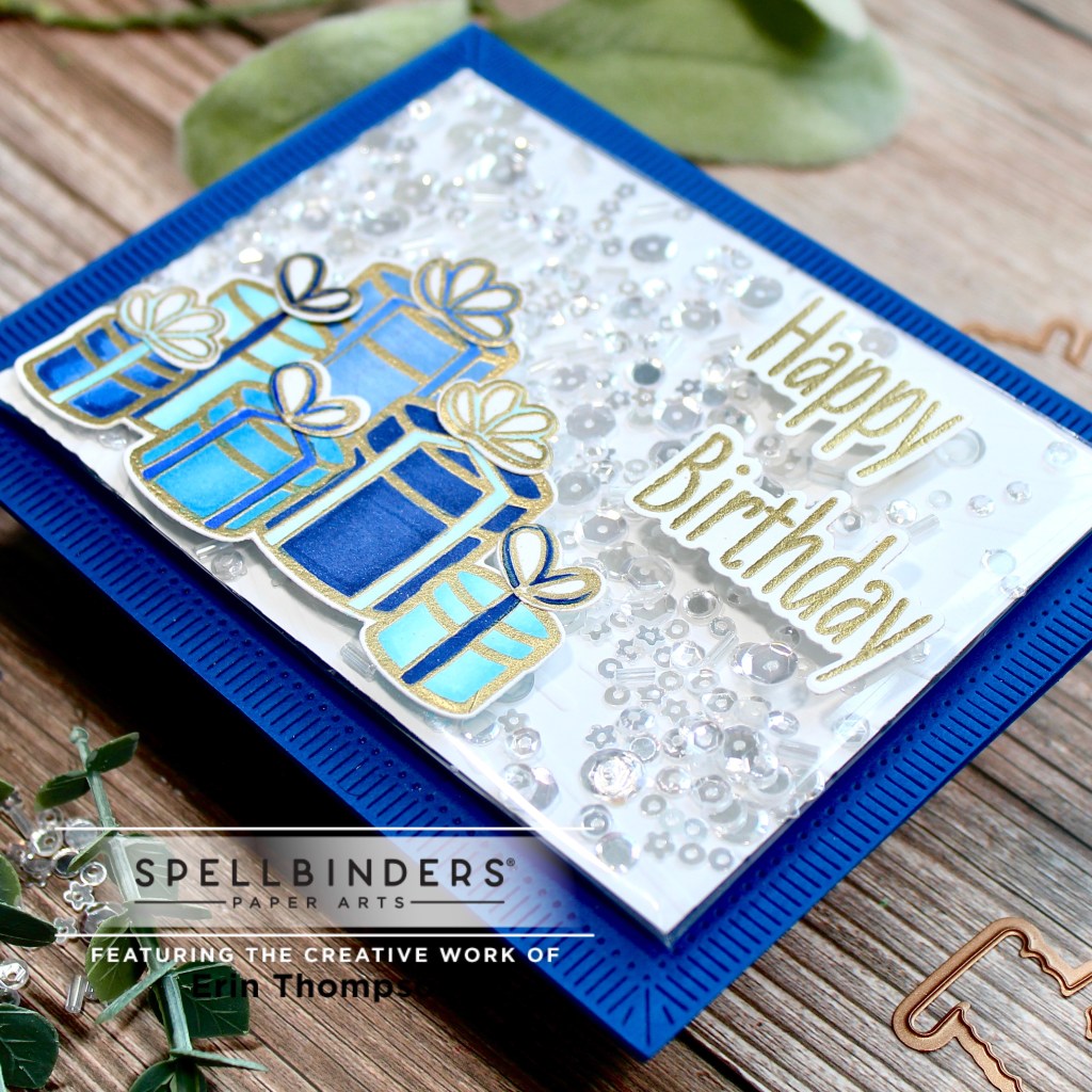 I heat embossed in gold WOW Embossing powder the stamped presents and Happy Birthday sentiment from the stamp set. Then I quickly Copic colored the presents in Gabe’s favorite color, blue. After I adhered those elements to the infinity shaker, I die cut a blue background panel using the Fluted Classics Rectangles die, and adhered to a matching card base.