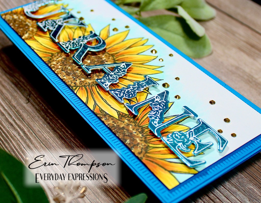 I fussy cut a mask of the single sunflower, and after stamping the large center flower, I stamped one on each side. Then I colored the flowers and background with Altenew Artist Markers (alcohol ink markers).