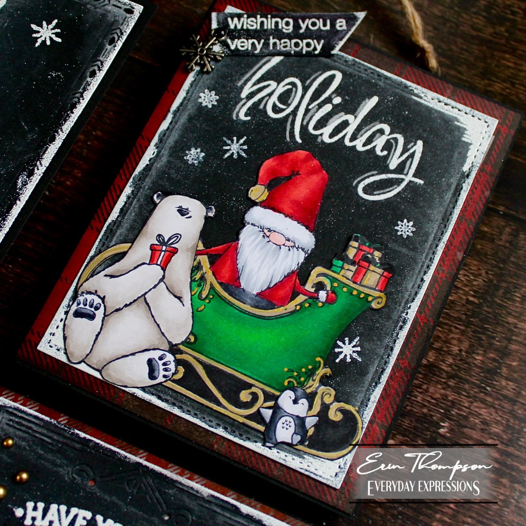 Some of the cards I Copic colored the images, fussy cut, and adhered to the chalkboard background. TIP: If you fussy cut or die cut an image for the black background, outline the image with a black marker so that it blends perfectly into the chalkboard look.