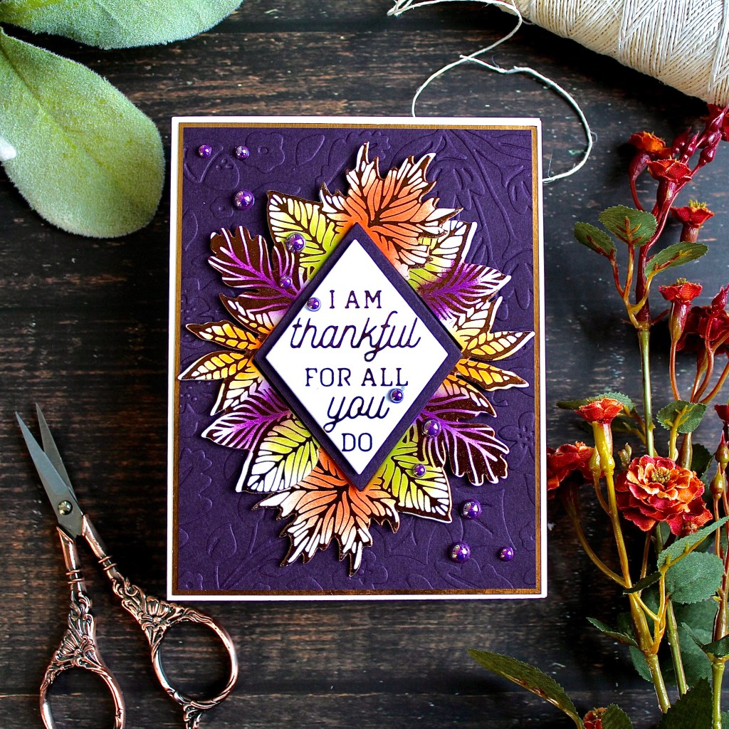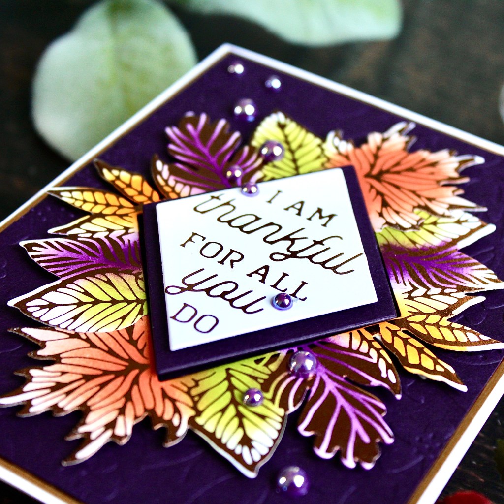 I used copper foil with the September Glimmer of the Month Club plates to create these gorgeous fall leaves. Then I quickly ink blended with Catherine Pooler inks with a small ink blending brush, and die cut the images. Next I embossed the eggplant cardstock using the September Embossing Folder of the Month for added background dimension.