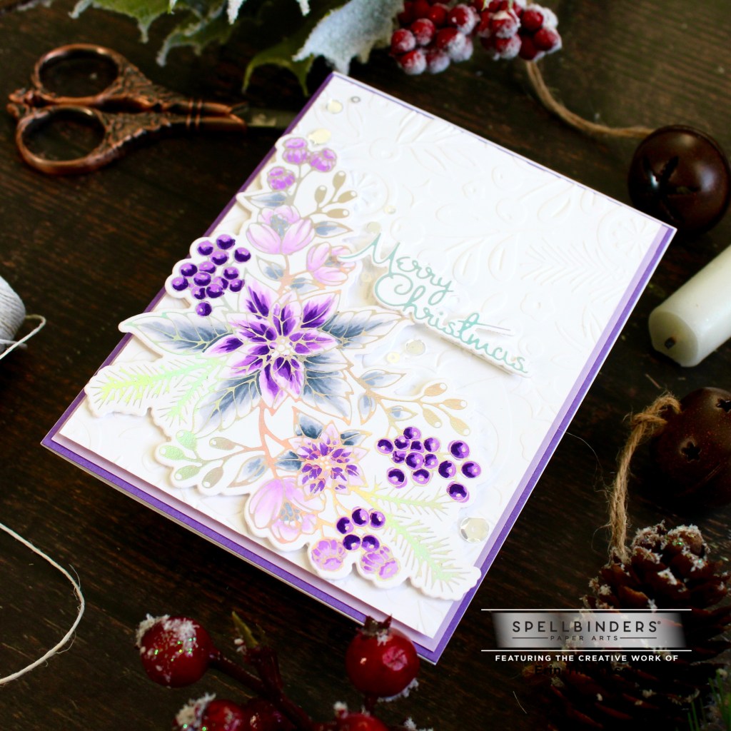 Then I die cut the image, and layered over a white embossed background using the new October Embossing Folder. Finally, I adhered everything over violet panels, and added reflective sequins.