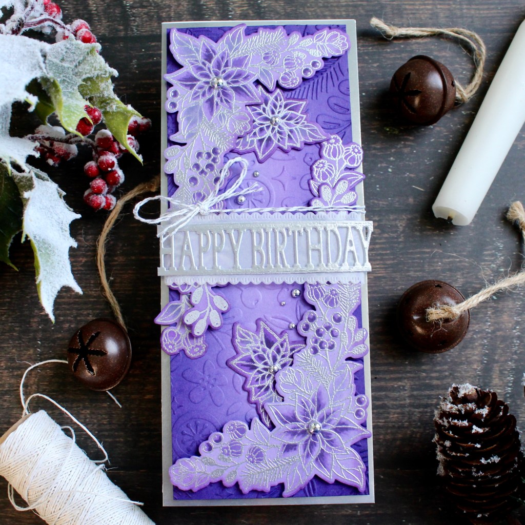 Hi Crafty Friends, and welcome back! Today I’m sharing a holiday/birthday card featuring the lavender and silver color combo I’ve loved this month. This card is for all of those December birthdays that often are forgotten due to the holiday.