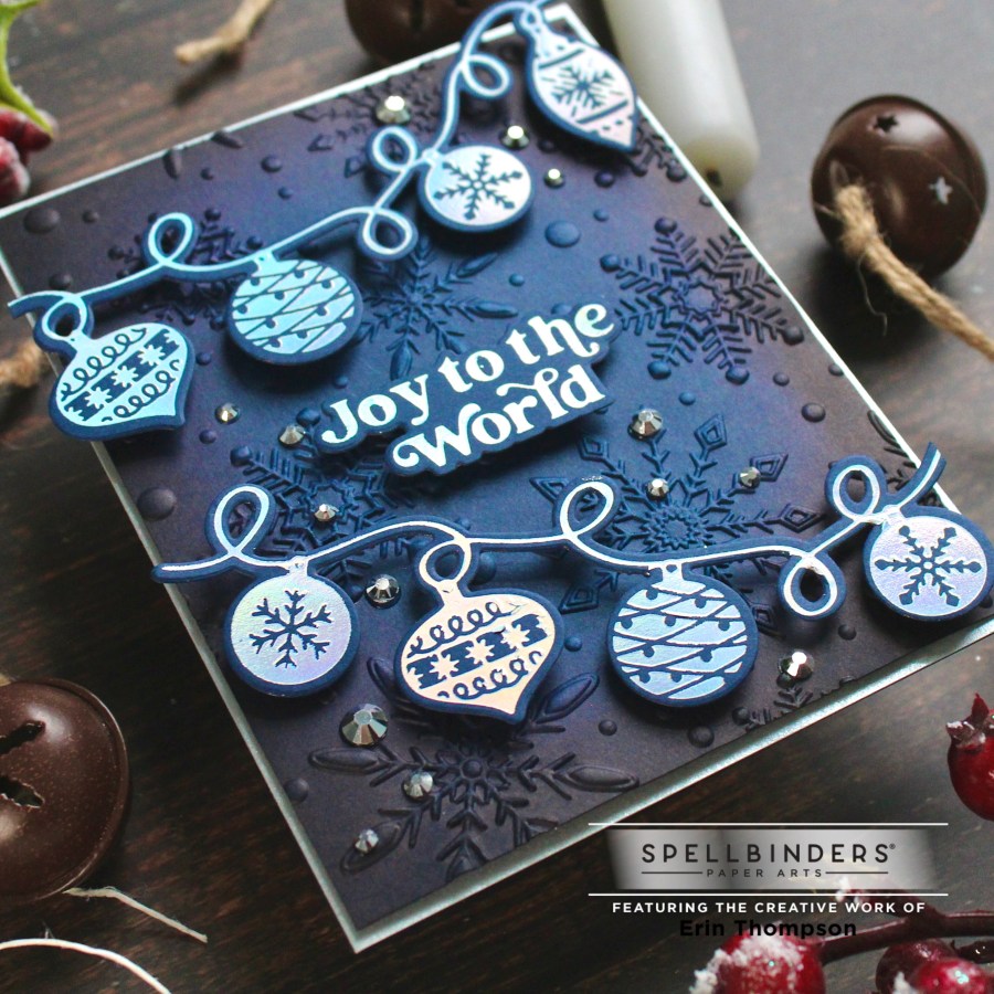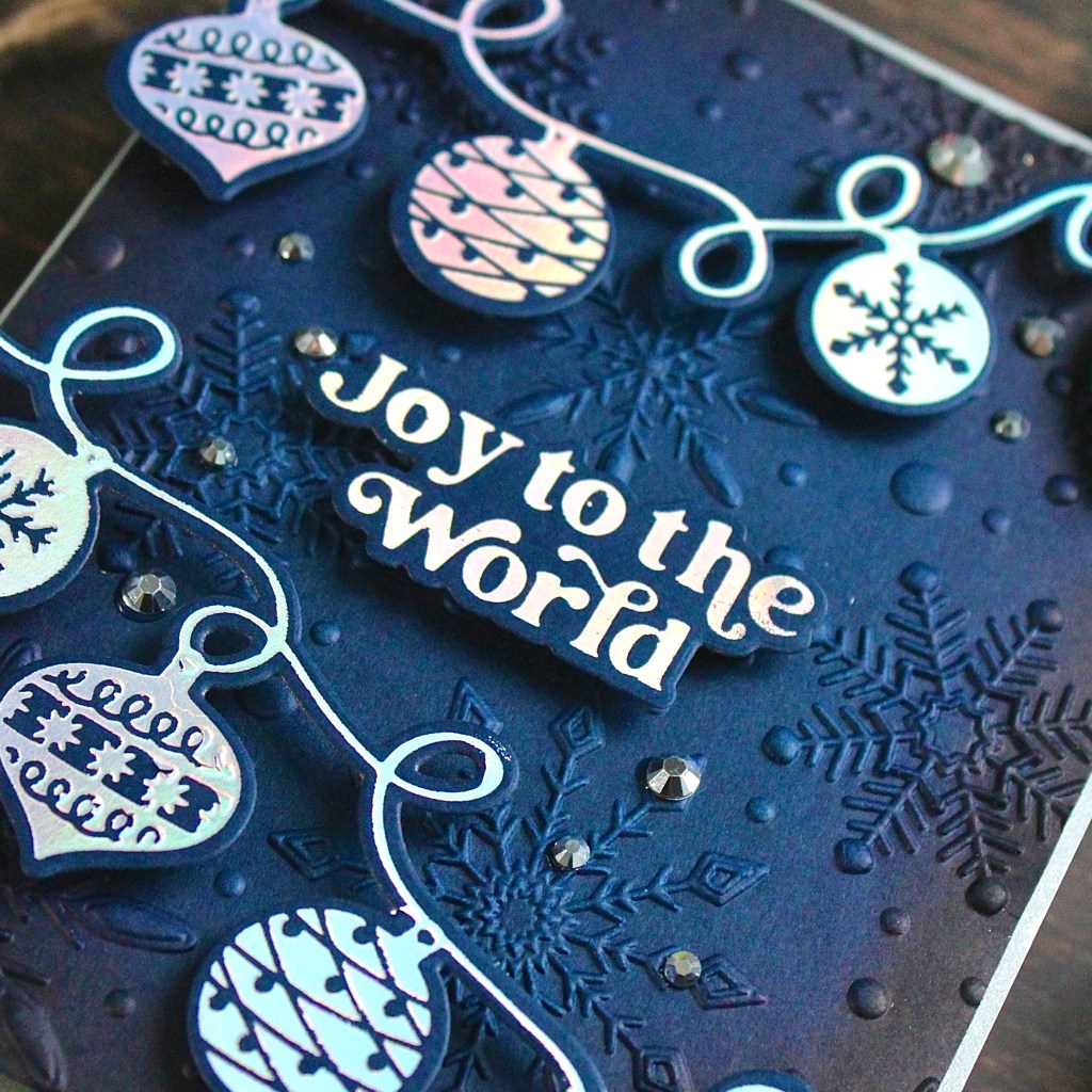 How pretty is that silver holographic foil on those string ornaments and Christmas sentiment? I paired the foiled pieces with the new 3D Embossing Folder Flurry of Snowflakes background panel.